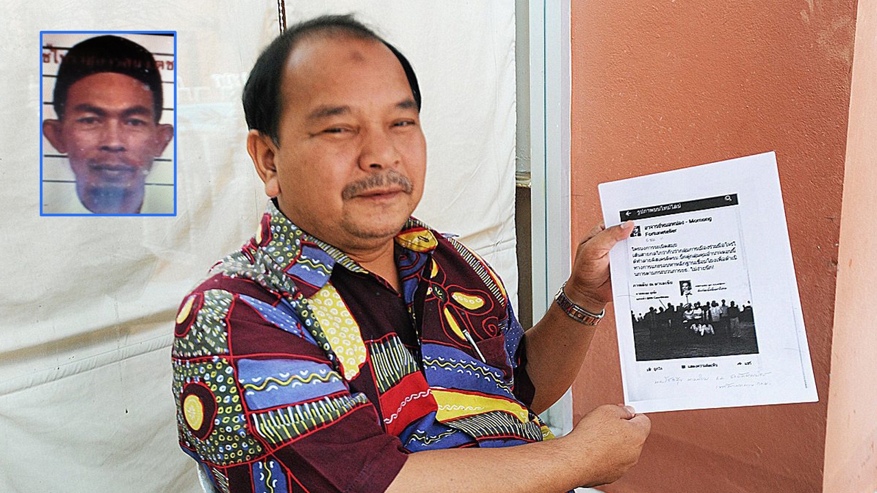 นายนัจมุดดิน อูมา อดีต ส.ส.นราธิวาส โชว์ภาพที่ มือดีนำไปโพสต์ในเฟซบุ๊ก ระบุเกี่ยวโยงกับเหตุคาร์บอมบ์ที่ อ.เกาะสมุย และแจ้งดำเนินคดี ส่วนรูปเล็กคือนายอับดุลรอนิง ดือราแม ผู้ต้องสงสัยที่ถูกออกหมายจับคดีคาร์บอมบ์.