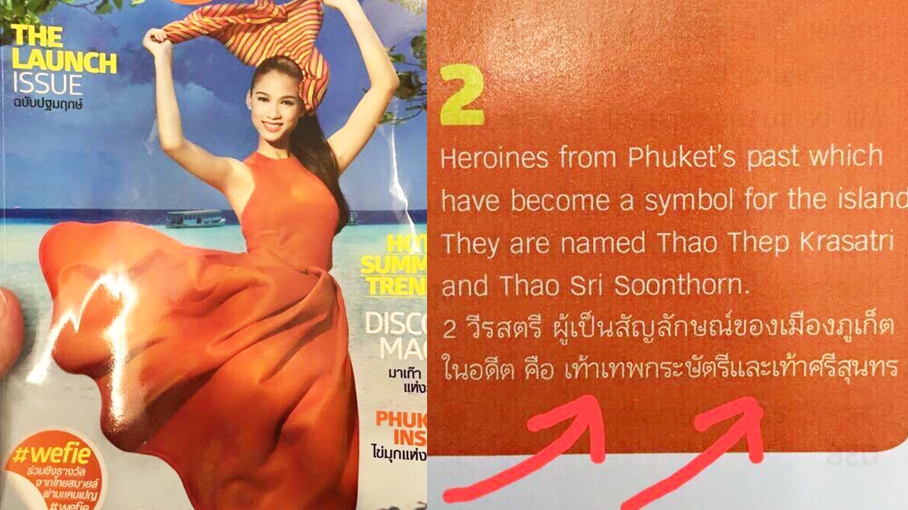 วันที่ 23 เม.ย. 58 มีรายงานว่า ในโลกออนไลน์ได้มีการโพสต์ภาพข้อความและปกนิตยสารเล่มหนึ่ง ประจำเดือน เม.ย. 2015 ซึ่งเป็นนิตยสารที่วางอยู่บนเครื่องบินของสายการบินแห่งหนึ่ง โดยหน้าปกระบุข้อความบางส่วน "Phuket Insider ไข่มุกอันดามัน" ขณะที่ภายในเนื้อหาของนิตยสารฉบับดังกล่าว มีการเขียนถึง 2 วีรสตรี ผู้เป็นสัญลักษณ์ของเมืองภูเก็ตในอดีต คือ เท้าเทพกระษัตรี - เท้าศรีสุนทร ทำให้ชาวภูเก็ตที่พบเห็นข้อความที่เขียนถึงผู้กอบกู้เอกราชและปกป้องเมืองถลางในครั้งอดีตต่างไม่พอใจ เนื่องจากมีการใช้คำผิดจนน่าเกลียด "เท้า" คือ อวัยวะของร่างกายที่ใช้เดิน ส่วนคำนำหน้าของ "ผู้เป็นใหญ่-พระเจ้าแผ่นดิน หรือตำแหน่งบรรดาศักดิ์ข้าราชการฝ่ายในครั้งอดีต" จะใช้คำว่า "ท้าว" ดังนั้น สิ่งที่ถูกต้องคือ ท้าวเทพกระษัตรี - ท้าวศรีสุนทร หรือ ย่ามุก - ย่าจัน ของพี่น้องชาวภูเก็ต ส่งผลให้มีการแชร์ข้อความในนิตยสารฉบับดังกล่าวกันอย่างกว้างขวาง พร้อมกับมีการวิพากษ์วิจารณ์สิ่งที่เกิดขึ้น
