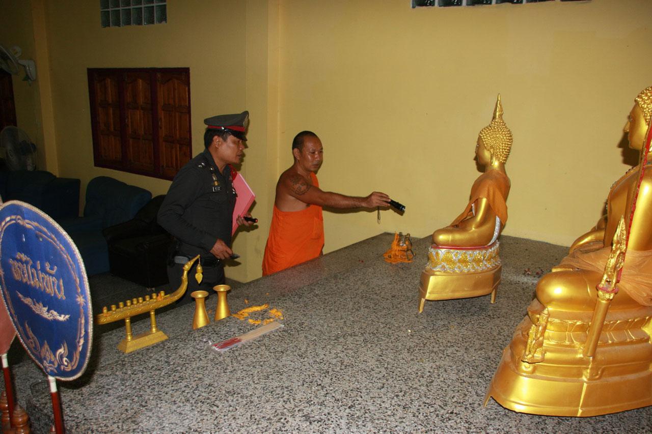 ต่อมา เวลาประมาณ 18.30 น. ตนเดินมาให้อาหารปลาในสระของศาลา สังเกตเห็นมีหน้าต่างเปิดไว้ 1 บาน ซึ่งปกติศาลาแห่งนี้จะไม่เปิดถ้าไม่มีญาตินำศพมาตั้งบำเพ็ญกุศล จึงไปตามพระอีกรูปหนึ่งให้นำกุญแจมาเปิดประตูศาลา ก็พบว่า มีพระพุทธรูปหายไป โดยคนร้ายได้ทิ้งรอยเท้าไว้บนโซฟา นอกจากนั้น ยังพบเก้าอี้พลาสติกที่เชื่อว่า คนร้ายคงจะยกมาต่อขาปีนเข้าออก ส่วนทรัพย์สินอื่น อาทิ เครื่องใช้ไฟฟ้า เครื่องขยายเสียงและโลงเย็นก็ยังอยู่ที่เดิม
