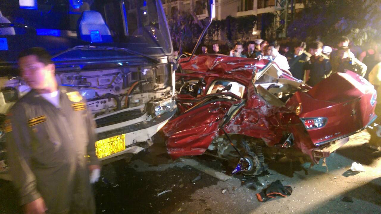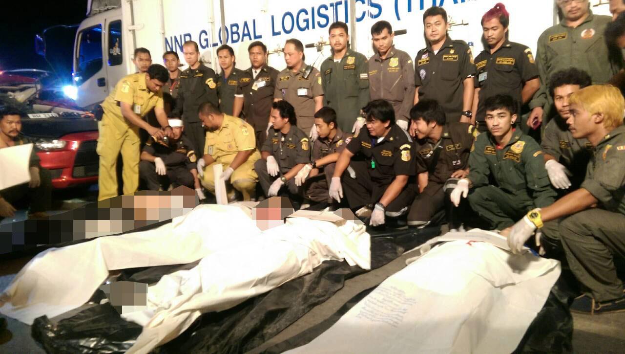 ในที่เกิดเหตุพบรถเก๋งสภาพรถด้านซ้ายพังยับทั้งคัน ท้ายรถยุบเข้าไป ด้านในรถพบร่างผู้เสียชีวิตเป็นชายทั้ง 4 คน มีนายจีระยุทธ กำลังเกื้อ อายุ 21 ปี นายธวัชชัย ไทยญานุสรณ์ อายุ 22 ปี นายพิทวัส เกียรติเดชาวิทย์ อายุ 22 ปี และ นายสาคร คงเครือ อายุ 22 ปี ทั้งหมดเป็นนักศึกษาชั้นปีที่ 3 คณะบริหารธุรกิจ มหาวิทยาลัยหัวเฉียวเฉลิมพระเกียรติ ทางเจ้าหน้าที่ช่วยนำร่างทั้งหมดออกจากซากรถ ก่อนนำส่งชันสูตร ส่วนรถบรรทุก 6 ล้อ เสียหายบริเวณด้านหน้าซ้าย