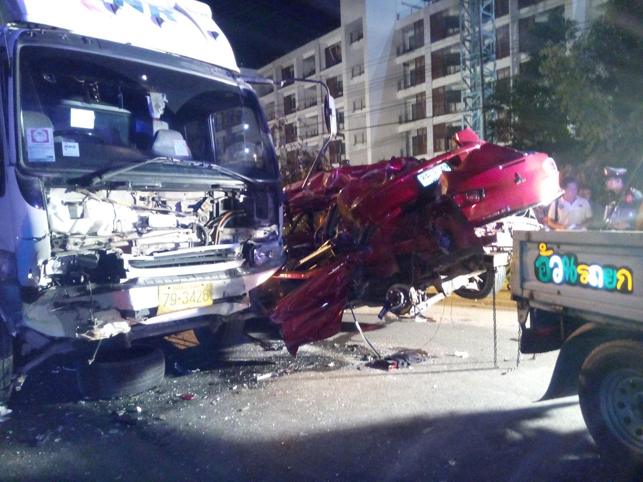 เมื่อเวลา 22.40 น. วันที่ 23 เม.ย. 58 ร.ต.ท.อรรถพล เจริญพร พงส.สภ.บางเสาธง จ.สมุทรปราการ รับแจ้งเหตุ รถเก๋งมิตซูบิชิ แลนเซอร์ สีแดง ทะเบียน ฆผ 2349 กรุงเทพมหานคร ชนประสานงากับรถบรรทุก 6 ล้อ สีขาว ทะเบียน 79-3426 กรุงเทพมหานคร บริเวณกลางถนนวัดศรีวารีน้อย หมู่ 1 หน้าสนามฟุตบอลศุลกากรก่อนถึงทางเข้าวัดหัวคู้ ต.ศรีษะจรเข้ อ.บางเสาธง จ.สมุทรปราการ เข้าตรวจสอบพร้อมมูลนิธิร่วมกตัญญู