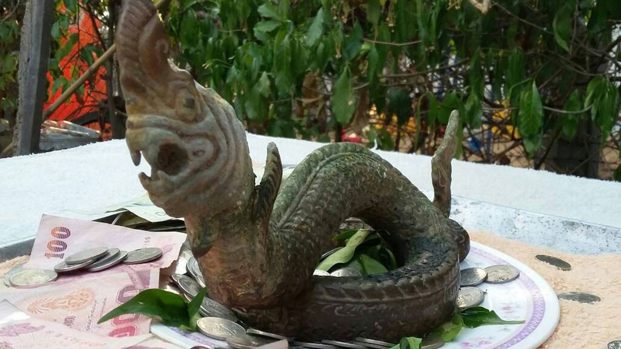 เมื่อเวลา 10.30 น. วันที่ 24 เม.ย.58 พ.ต.อ.วีระวัฒน์ สระบัว ผกก.สภ.เมืองร้อยเอ็ด ได้รับหนังสือราชการจาก น.ส.กนกวลี สุริยะธรรม หัวหน้าพิพิธภัณฑสถานแห่งชาติ จ.ร้อยเอ็ด เพื่อแจ้งให้ทราบว่า ก่อนหน้านี้เมื่อวันที่ 23 เม.ย.ที่ผ่านมา สภ.เมืองร้อยเอ็ด ได้ส่งรูปหล่อพญานาค ขนาดกว้าง 30.8 ซม. ยาว 24 ซม. และสูง 34.3 ซม. ซึ่งก่อนหน้านั้น เมื่อเวลา 15.00 น. วันที่ 20 เม.ย.ที่ผ่านมา ได้ติดแหของนายสายัณต์ จอมคำสิงห์ อายุ 45 ปี อยู่บ้านเลขที่ 30 บ้านแก่นทราย หมู่ 2 ต.รอบเมือง อ.เมืองร้อยเอ็ด ขณะทอดหาปลาอยู่ในหนองน้ำมะนาว ในทุ่งนาห่างจากบ้านแก่นทรายไปทางทิศตะวันตกเฉียงเหนือ ระยะทาง 1.5 กม. แล้วนำไปเก็บไว้ที่บ้านเพื่อบูชา