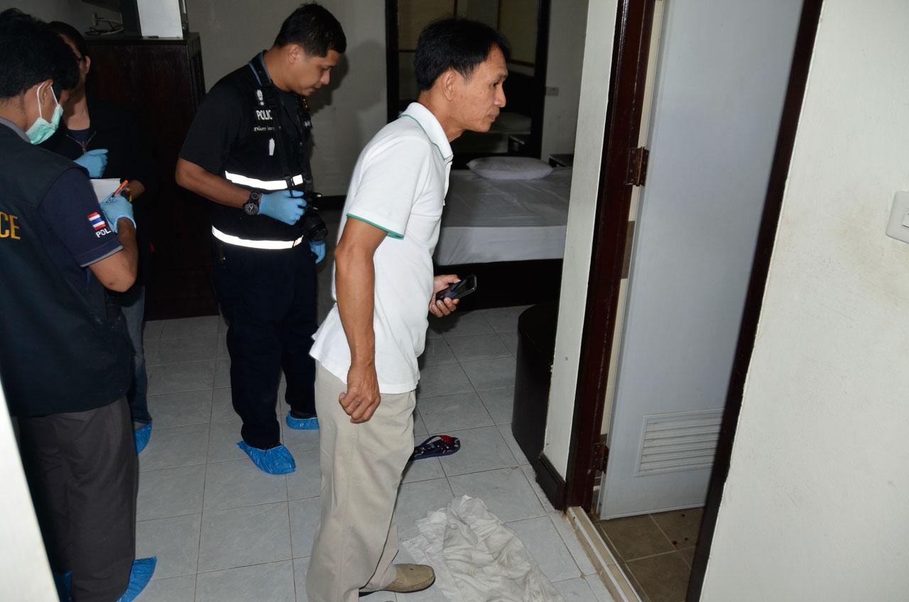 ที่เกิดเหตุ พบศพหญิงอายุประมาณ 30 ปี นอนเสียชีวิตเปลือยกายอยู่ในห้องน้ำ สภาพศพถูกรัดคอด้วยสายไฟที่คอ และแผลถูกแทงที่หน้าอก จากการสอบสวนพนักงานที่ดูแล ให้การว่าก่อนเกิดเหตุ เวลา 15.57 น. ได้มีชาย ซึ่งเป็นลูกค้าที่มาใช้บริการเป็นประจำ อายุประมาณ 60 ปี ขี่รถจักรยานยนต์สีดำ ไม่ติดแผ่นป้ายทะเบียน สวมหมวกกันน็อก เข้ามาทางประตูหลังและฝ่ายหญิงก็ขี่รถจักรยานยนต์เข้ามาทางประตูหน้า มาจอดรอกันที่หน้าห้องก่อนเล็กน้อย จากนั้นเห็นทั้งสองคนพูดคุยหยอกล้อกันและเข้าไปในห้องประมาณครึ่งชั่วโมง ฝ่ายชายก็รีบขี่รถจักรยานยนต์ออกไป