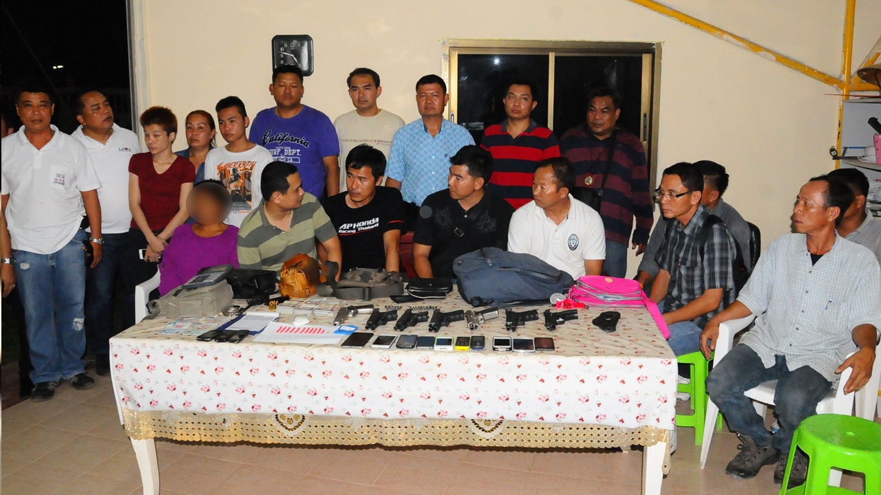 เมื่อเวลา 19.00 น. วันที่ 26 เม.ย.58 ที่ด่านพรมแดนสะพานมิตรภาพไทย-ลาว จ.หนองคาย พล.ต.ต.ชูรัตน์ ปานเหง้า ผบก.ภ.จว.หนองคาย พร้อมด้วยพ.ต.อ.อัครพงศ์ พิมลศิริ รอง ผบก.ภ.จว.หนองคาย พ.ต.อ.อภิศักดิ์ กรองทิพย์ ผกก.สภ.เมือง เข้าจับกุม ร.ต.อ.สุรพัศ เพ็ญศรี รอง สว.สส.สภ.เมืองอุดรธานี ร.ต.ท.พีระพงษ์ ตรีพงษ์ รองสว.สส.สภ.เมืองอุดรธานี ร.ต.ต.สมเด็จ สุขรมย์ รองสว.สส.สภ.เมืองอุดรธานี ด.ต.ปกรณ์ สุขประเสริฐ ผบ.หมู่ ป.สภ.หนองหาน จ.อุดรธานี ด.ต.ชัยณรงค์ อรดี ผบ.หมู่ จร.สภ.เมืองอุดรธานี ด.ต.วิรัตน์ ตานุชนม์ ผบ.หมู่ (สส.)สภ.เมืองอุดรธานี นายธวัช ทิพสุภา ตำรวจอาสา และนายตี๋ อาจสุวรรณ์ พร้อมของกลาง อาวุธปืนพกสั้น 7 กระบอกพร้อมกระสุนจำนวนมาก ปืนลูกซองยาว 1 กระบอก เงินสด 300,000 บาท ยาบ้า 108 เม็ด ยาไอซ์ 1 ถุง รถยนต์กระบะ 2 คัน รถยนต์เก๋ง 1 คัน