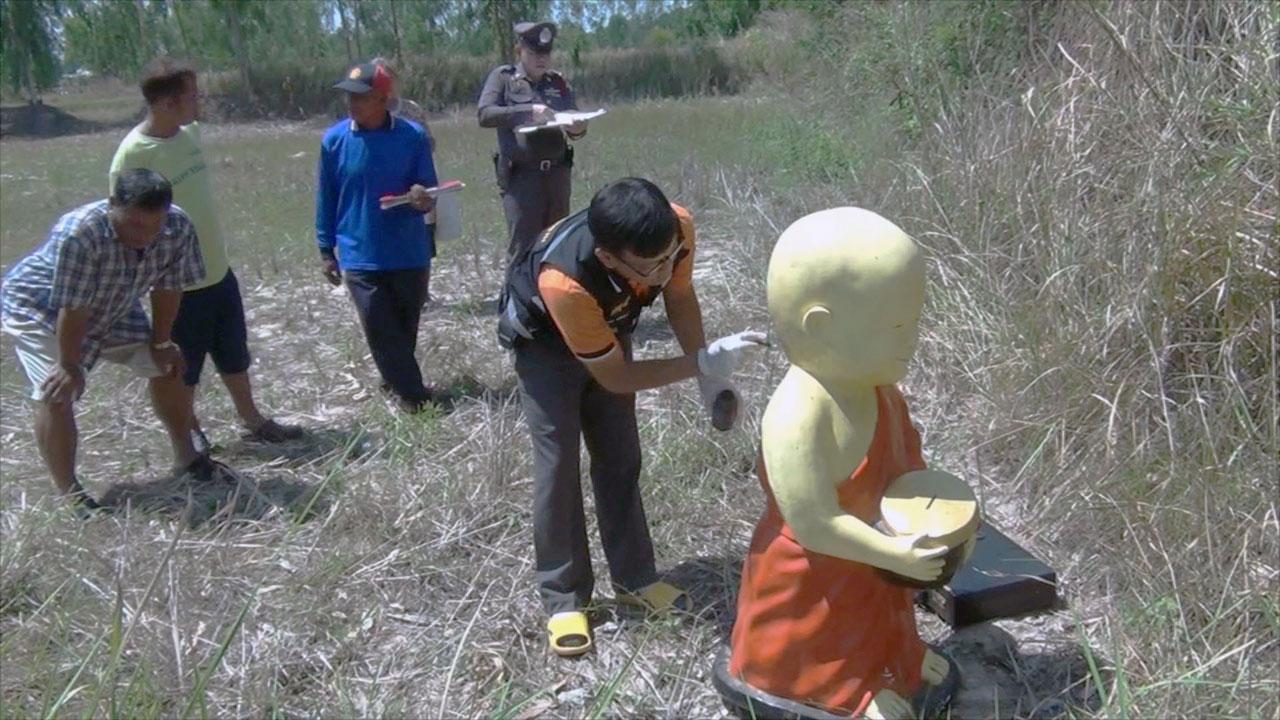 พบพระจำลอง ปัญญษวฑฒโณ เจ้าอาวาสสำนักสงฆ์ นำตรวจที่เกิดเหตุ พร้อมให้การว่า ตั้งสำนักสงฆ์ได้ประมาณ 5 ปี ที่ศาลาการเปรียญมีตู้บริจาคทำเป็นรูปปั้นเณรน้อยสูงประมาณ 1.20 เมตร ปกติจะมีชาวบ้านมาทำบุญทุกเช้า และบริจาคเงินใส่รูปปั้นเณรเพื่อนำไปจ่ายค่าน้ำค่าไฟ เมื่อวานนี้ยังเห็นเณรน้อยตั้งอยู่ในศาลา คาดว่าจะมีเงินในรูปปั้นประมาณ 5,000 บาท แต่เช้าวันนี้ รูปปั้นเณรได้หายไป ซึ่งรูปปั้นเณรเคยหาย และถูกทุบเอาเงินไป 2 ครั้งแล้ว ครั้งนี้เป็นครั้งที่ 3 จึงแจ้งตำรวจ