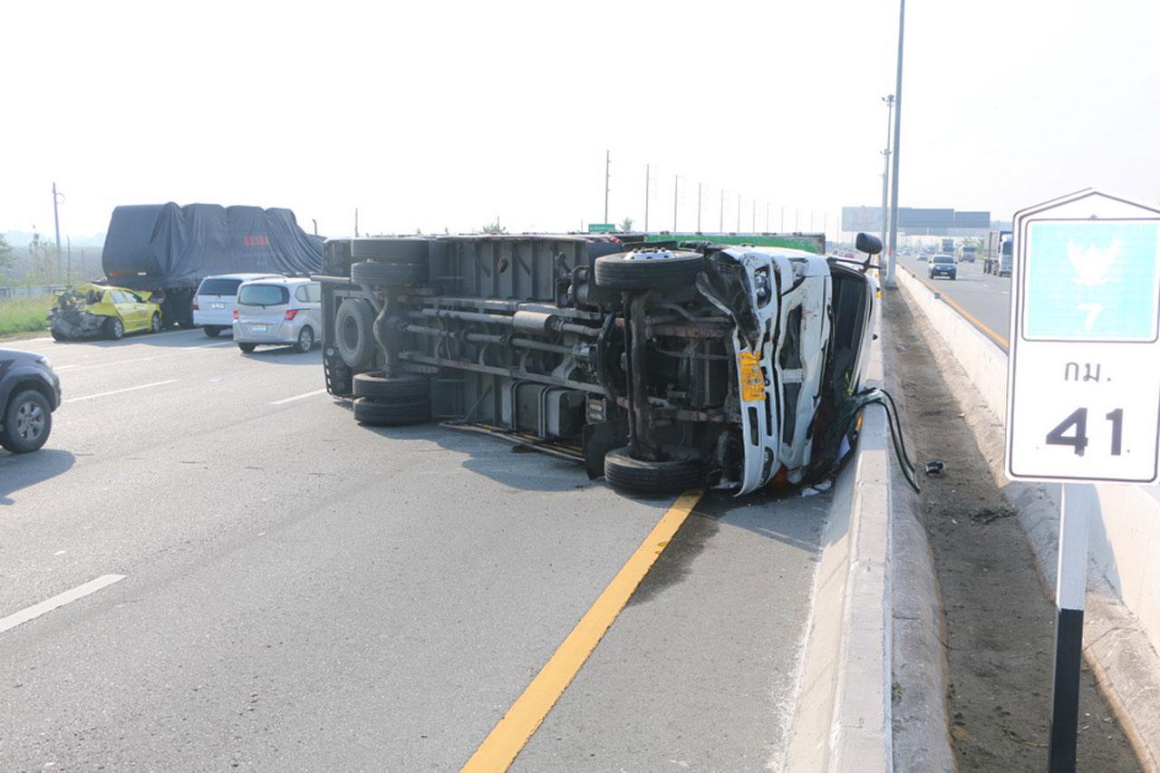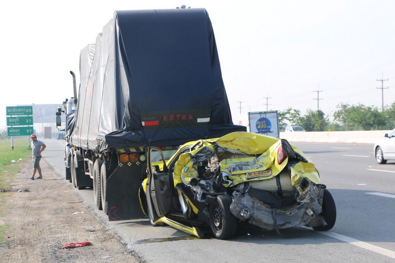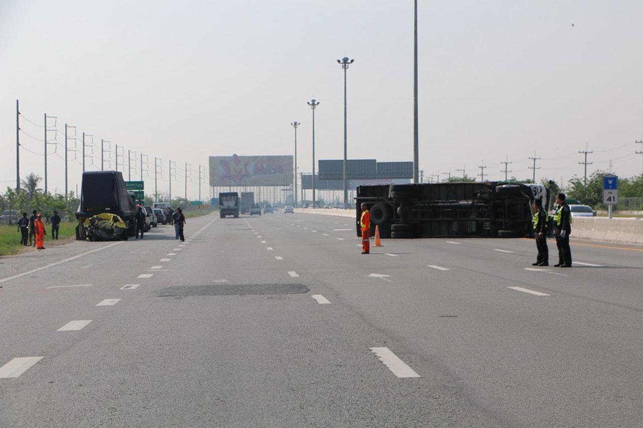 ที่เกิดเหตุพบ รถบรรทุกหกล้อ ฮีโน่ สีขาว ทะเบียน 71-2069 สมุทรปราการ พลิกคว่ำขวางถนนอยู่เลนขวา ภายในรถพบคนขับทราบชื่อ นายนิคม ทำแกว อายุ 39 ปี ได้รับบาดเจ็บเล็กน้อย และอยู่ในอาการมึนงง ใกล้กันพบ รถแท็กซี่ โตโยต้า ลิโม สีเหลือง ทะเบียน ทว 9898 กทม. สภาพด้านหลังพังเสียหายทำให้แก๊สรั่ว ชนท้าย รถพ่วง 18 ล้อ สแกนเนีย สีขาว ทะเบียนตัวแม่ 87-9580 กทม. ทะเบียนตัวพ่วง 89-9714 กทม. ที่จอดอยู่ไหล่ทาง โดยมี นายบุญเพ็ง หิมวรรณ อายุ 30 ปี เป็นคนขับ บริเวณไหล่ทาง ห่างจากจุดชนประมาณ 10 เมตร พบศพผู้เสียชีวิต 1 ราย ทราบชื่อนายสุรศักดิ์ ธีธรรม อายุ 37 ปี คนขับรถแท็กซี่ สภาพกระดูกหักทั้งตัว ตัวเปื้อนดิน