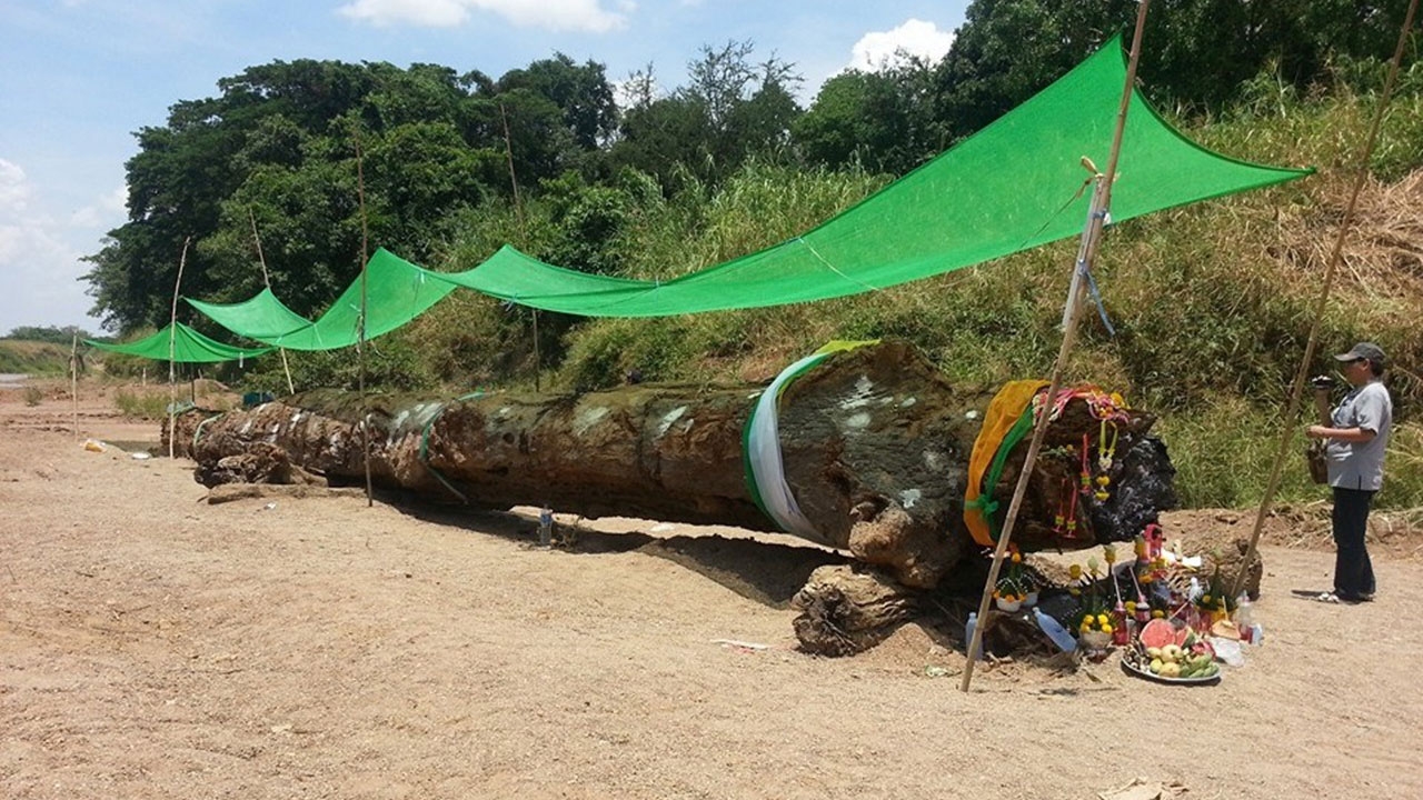 จากการสอบถาม นายจาน แจ่มทุ่ง อายุ 30 ปี พนักงาน บ.เทิดไทแอนด์โค จำกัด รับเหมาขุดลอกแม่น้ำยมในช่วงดังกล่าวว่า ขณะที่ตนขับรถแบ็กโฮขุด ลอกอยู่บริเวณกลางแม่น้ำยม ที่กำลังแห้งขอด พบว่ามีต้นไม้ขนาดใหญ่ถูกฝังจมดินอยู่ เมื่อขุดไปเรื่อยๆ ถึงได้ทราบว่าต้นไม้มีความยาวมาก จึงรีบปรึกษากับทางผู้รับเหมา จากนั้นนายประสาน มาลัยหวล อายุ 53 ปี ผู้ช่วยผู้ใหญ่บ้าน ได้เกณฑ์ชาวบ้านช่วยกันชักลากขึ้นมาจนสำเร็จ โดยนำไปวางไว้ริมน้ำยมฝั่งตะวันออก ด้านหลังวัดโสภาราม หมู่ 7 ต.สามเรือน อ.ศรีสำโรง อยู่ห่างจากจุดที่พบตะเคียนยักษ์ประมาณ 50 เมตร