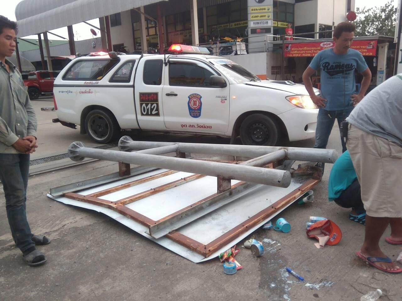 ที่เกิดเหตุพบความเสียหาย หลังรถบรรทุกเฉี่ยวชนป้ายโฆษณา ที่ติดตั้งกับเสาเหล็กริมทาง ทำให้ป้ายหลุดตกลงมาใส่ประชาชนที่กำลังปั่นจักรยานสองล้อผ่านมาพอดี ทำให้ถูกป้ายทับที่ศีรษะและแขน ได้รับบาดเจ็บสาหัส จึงปฐมพยาบาลเบื้องต้น และขอสนับสนุนทีมกู้ชีพจาก รพ.วังน้อย มานำผู้บาดเจ็บส่งโรงพยาบาล
