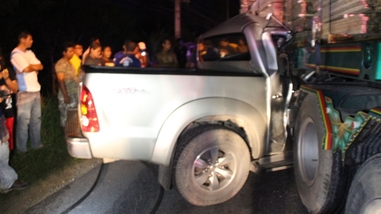18 ล้อ บรรทุกไม้ยางพารา กลับรถลักษณะขวางถนน เสี่ยบ่อกุ้งขับวีโก้ตามหลัง พุ่งเสย เข้าใต้ท้องรถ เสียชีวิตคาที่ ตร.แจ้งข้อหา 18 ล้อ ขับรถประมาททำให้ผู้อื่นถึงแก่ความตาย