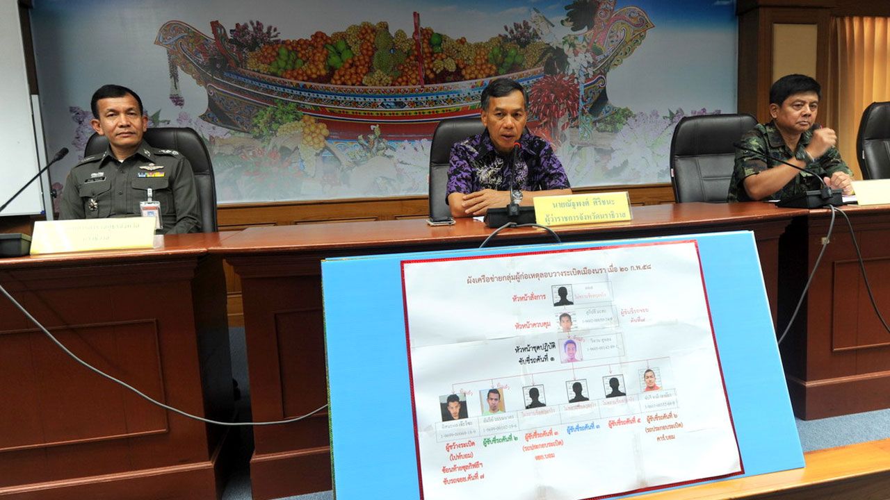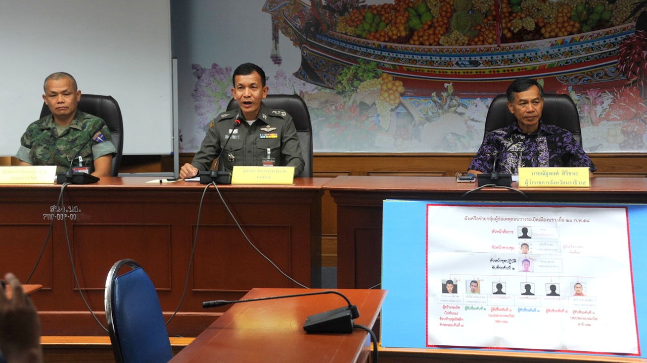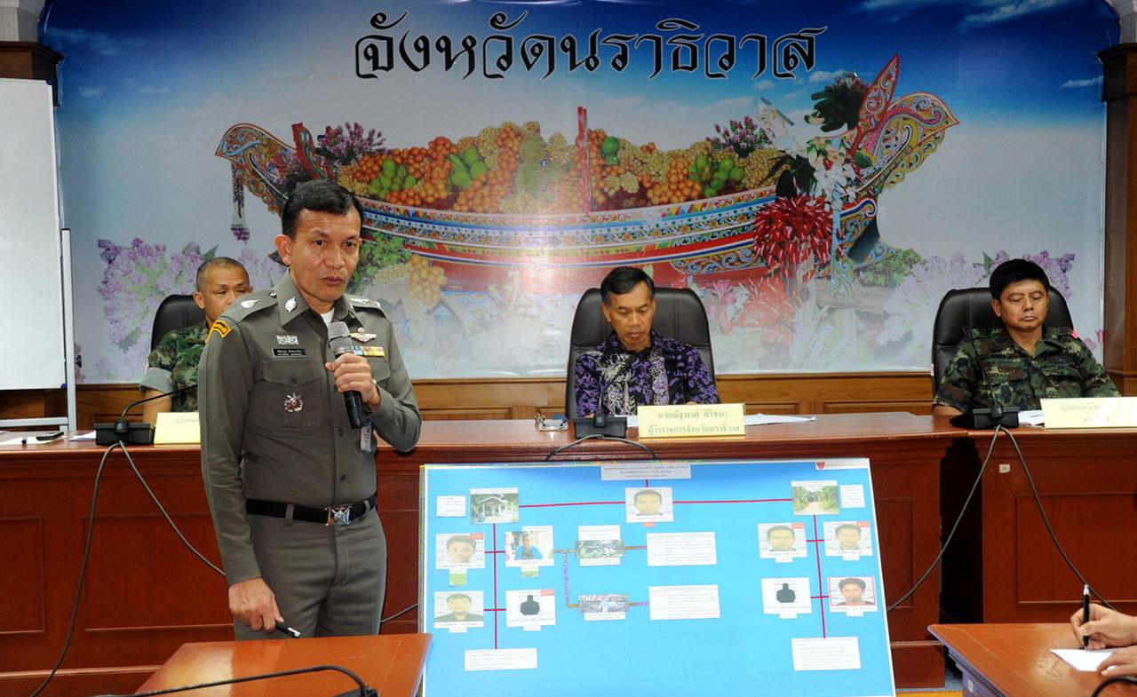 ผวจ.นราธิวาส นำทหาร ตร. ร่วมแถลงความคืบหน้า 5 คดีสำคัญที่เป็นคดีอุกฉกรรจ์สะเทือนขวัญ ทั้งวางระเบิดรถ นอภ. ฆ่าเผาชาวไทยพุทธ ยิงปลัด อบต. คนร้ายถูกจับได้บางส่วน สารภาพทำเพราะเห็นแก่เงินค่าจ้างครั้งละ 3 พันบาท ไม่ใช่อุดมการณ์...