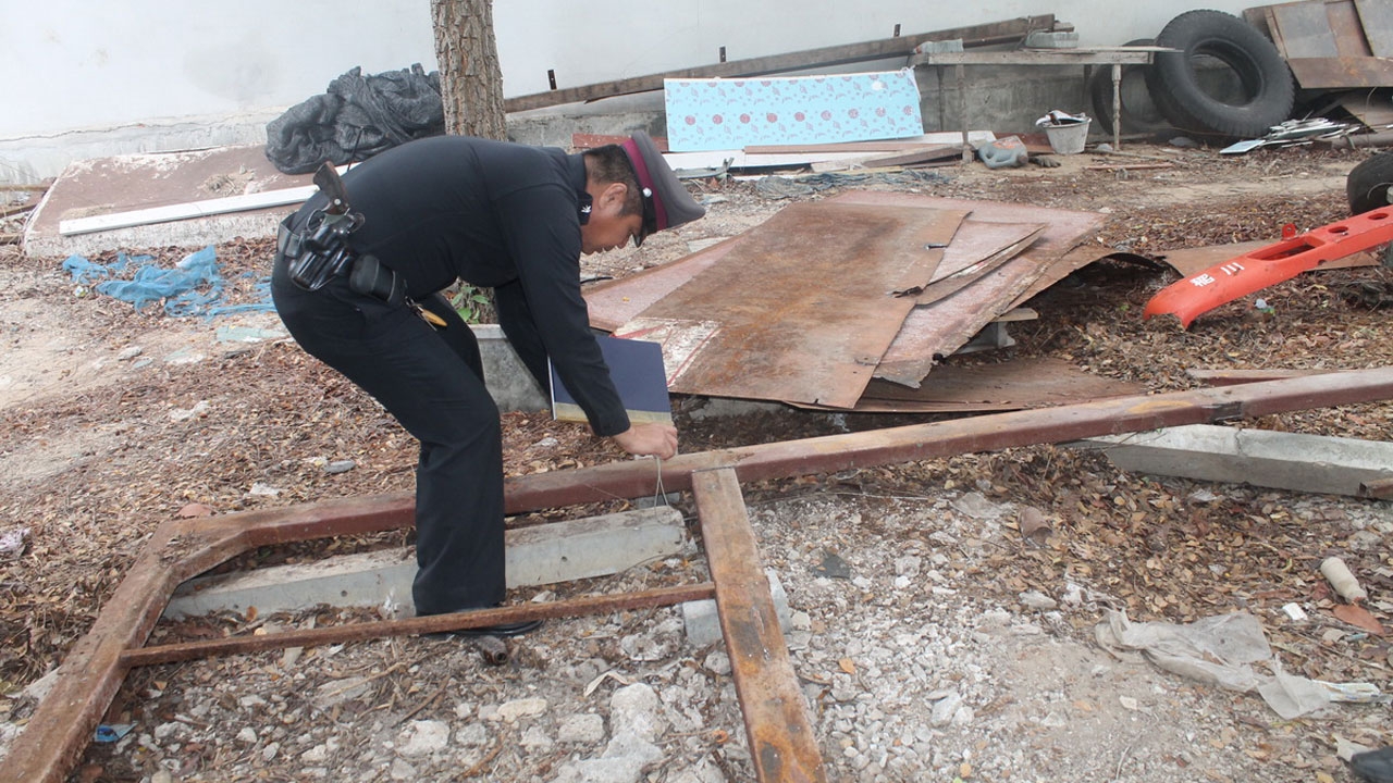 จากนั้นตำรวจเดินทางไปบ้านที่เกิดเหตุ เลขที่ 72 หมู่ 15 ตำบลนิคมทุ่งโพธิ์ทะเล อ.เมืองกำแพงเพชร เปิดให้บริการปั๊มน้ำมัน ร้านขายวัสดุก่อสร้าง และโรงหล่อเสาปูน ในบริเวณดังกล่าวพบเครื่องตัดเหล็ก ที่ผู้ตายใช้ตัดโครงประตูเหล็กมีสภาพใบเจียรเหล็กแตกกระเด็นตกอยู่ นอกจากนี้พบกองเลือดอยู่ที่โครงเหล็ก และมีรอยเลือดไหลเป็นทางยาวอีกด้วย