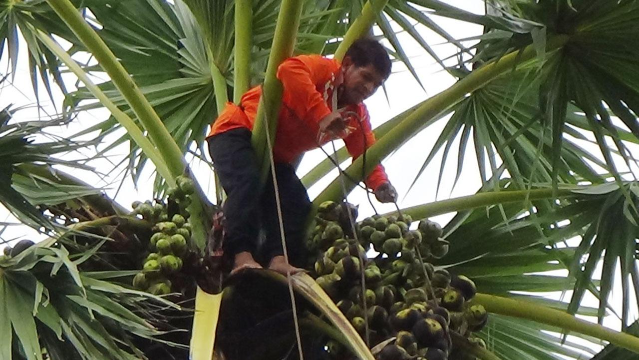 นายสนธิ กล่าาวอีกว่า แต่ละวัน ตนเองและครอบครัวจะออกไปปีนต้นตาลกลางนา ที่ได้ตกลงเช่ากับเจ้าของนาไว้ ในราคาต้นละ 100 บาท เมื่อไปถึงก็จะอาศัยความสามารถในการปีน โดยใช้ไม้ไผ่ที่เรียกว่า พะอง พาดต้นตาลแล้วปีนขึ้นไป เมื่อสุดปลายไม้ไผ้ ก็ปีนขึ้นต้นตาลต่อด้วยสองมือและสองเท้า ขึ้นไปจนถึงยอดต้นตาลที่อยู่สูงจากพื้นดินกว่า 15 เมตร