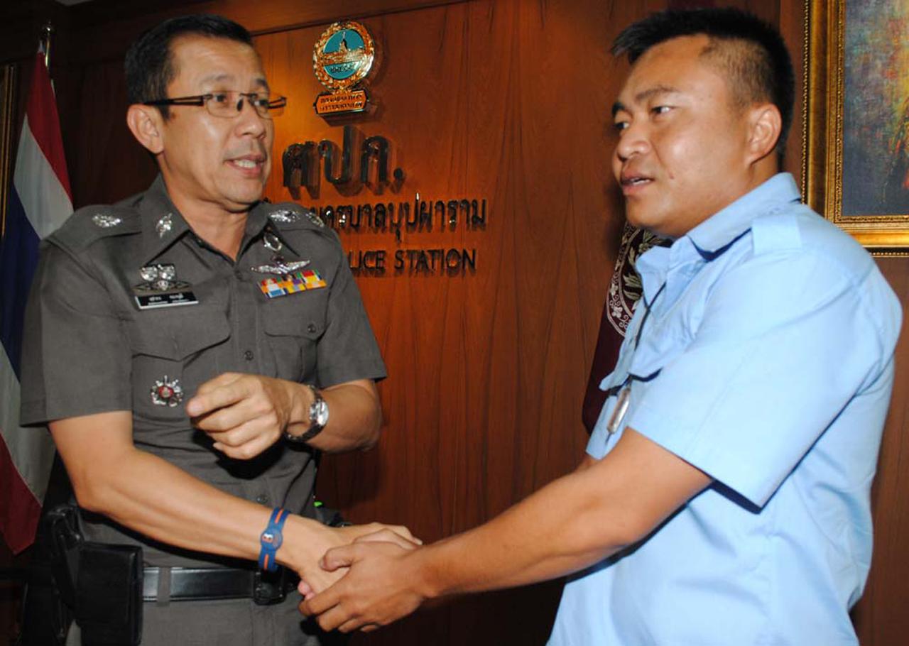 “โชคดีที่มี รอง สว.สส.สน.บุปผาราม จำนวน 2 นาย ประกอบด้วย ร.ต.ท.ณรงค์ น้อยวงษ์ อายุ 59 ปี และ ร.ต.ต.กังวาน โพธิ์ชู อายุ 53 ปี ไปดักซุ่มเฝ้าระวังเหตุวิ่งราวทรัพย์ ตามคำสั่งสารวัตรสืบสวนบริเวณนั้นพอดี ทาง ร.ต.ต.กังวาน จึงรีบโบก รถจักรยานยนต์ของพลเมืองดี ตามไปสกัดจับกุม นายสมมาตร ไว้ได้ ที่ลานก่อสร้างใกล้เคียงเมอรี่คิงส์ สาขาวังบูรพา แต่จังหวะเข้าชาร์จเกิดการต่อสู้กัน ทำให้ ร.ต.ต.กังวาน ได้รับบาดเจ็บมีอาการอักเสบในช่องท้อง นายทวีศักดิ์ จึงหลบหนีไปได้ก่อน แต่ท้ายที่สุดก็ถูกขยายผลตามไปจับกุมได้ในช่วงบ่ายวันนี้ ที่ จ.สมุทรปราการ โดยหลังจากนี้ จะทำพิธีมอบประกาศนียบัตรเชิดชูวีรกรรมของโชเฟอร์พลเมืองดี และเยียวยาตำรวจที่ได้รับบาดเจ็บ จากการปฏิบัติหน้าที่ต่อไป” พล.ต.ต.ฤชากร กล่าว