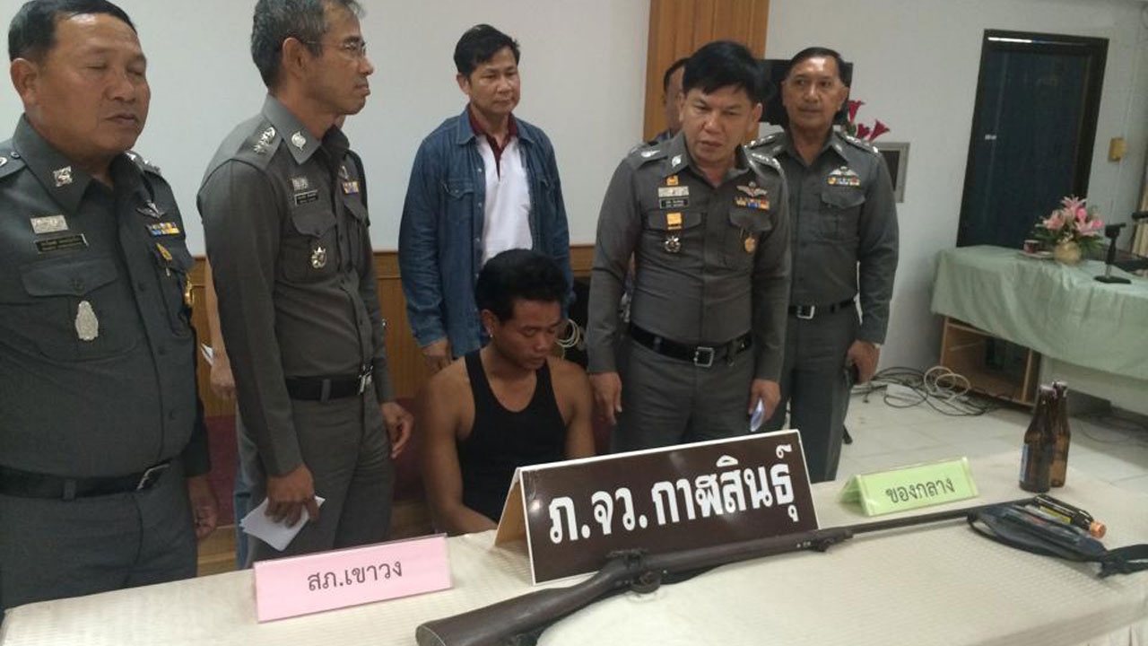โดยนายแดง (นามสมมติ) ผู้ต้องหา ให้การว่า ช่วงค่ำวันที่ 19 พ.ค. 58 ตนนั่งดื่มเหล้าอยู่ เห็นพ่อ-แม่ ทะเลาะกันอย่างรุนแรง เข้าไปห้ามปรามและเห็นพ่อถือปืนแก๊ปกำลังจะยิงแม่ จึงเข้าไปแย่งปืนตนจับที่ด้ามปืน ส่วนพ่อจับปลายปืน ยื้อกันอยู่สักพักหนึ่งมือของตนพลาดไปโดนนกปืนทำให้ปืนลั่น ถูกหน้าอกด้านซ้ายของพ่อ แน่นิ่งเสียชีวิต ด้วยความตกใจ จึงอุ้มพ่อขึ้นนอนที่เปลห่มผ้า นั่งเฝ้าอยู่จนเช้า ชาวบ้านมาพบศพจึงแจ้งตำรวจ เข้าตรวจสอบ