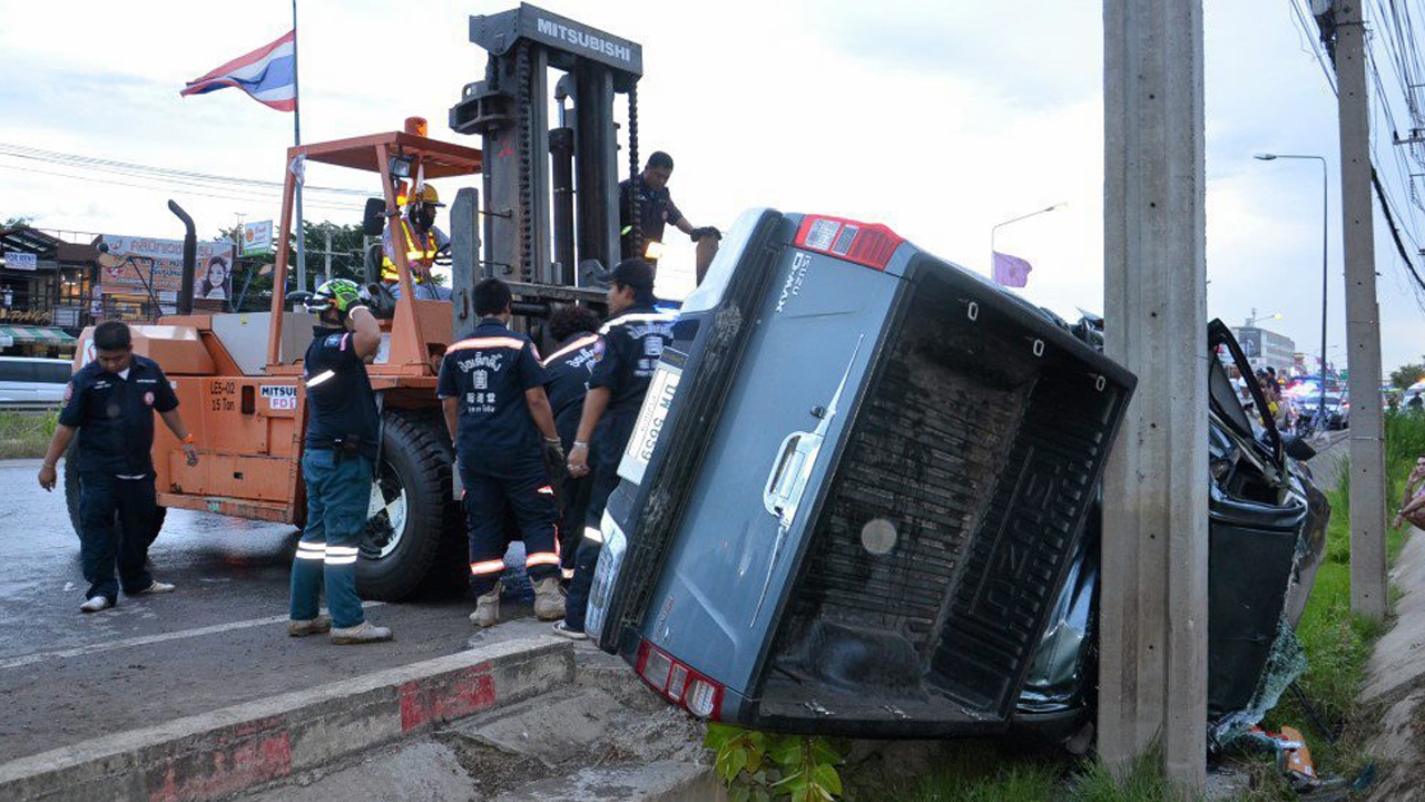 รถปิกอัพขับห้อฝ่าฝนและพายุลมแรง เสียหลัก หมุนคว้างตกร่องกลางถนนพลิกตะแคงฟาดกับเสาไฟฟ้าโครมสนั่น รถพังยับหลังคายุบอัดก๊อบปี้คนในรถบาดเจ็บสาหัส 1 คน ที่เหลือเป็นชาย 3 คน หญิง 1 คน ตายคาที่ ทราบชื่อเพียง 2 คน แต่ยังไม่รู้ใครเป็นคนขับ พยานเผยนาทีมรณะ ช่วงเกิดเหตุฝนเริ่มตกและมีลมพายุพัดแรง ทำให้ถนนลื่นประกอบกับรถปิกอัพมรณะขับมาด้วยความเร็ว เป็นเหตุให้รถเสียหลักหมุนฟาดเสาไฟมีผู้เสียชีวิตและบาดเจ็บยกคัน