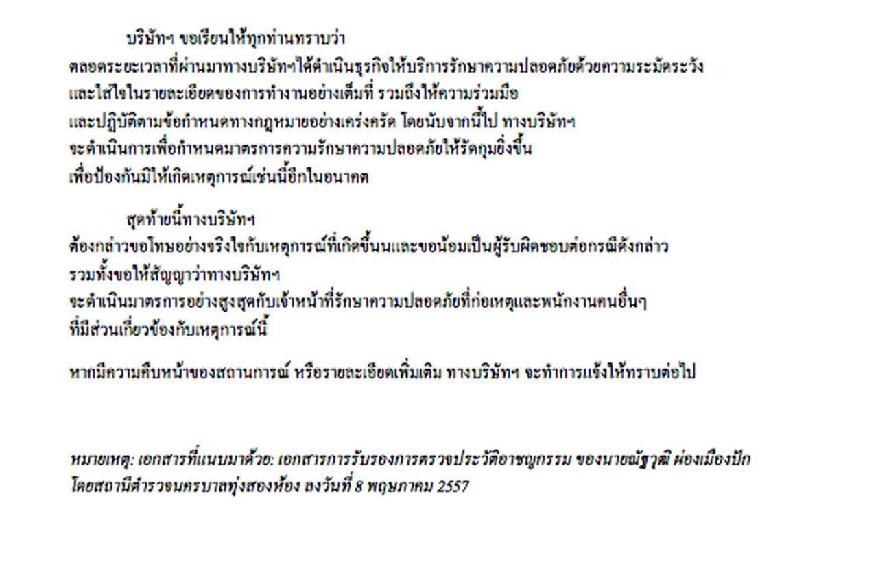 ทางบริษัทฯ จะดำเนินการเพื่อกำหนดมาตรการในการรักษาความปลอดภัยให้รัดกุมยิ่งขึ้น เพื่อป้องกันมิให้เกิดเหตุการณ์เช่นนี้อีกในอนาคต อีกทั้ง ต้องกล่าวขอโทษอย่างจริงใจกับเหตุการณ์ที่เกิดขึ้น และขอน้อมเป็นผู้รับผิดชอบต่อกรณีดังกล่าว รวมทั้งขอให้สัญญาว่าทางบริษัทฯ จะดำเนินมาตรการอย่างสูงสุดกับเจ้าหน้าที่รักษาความปลอดภัยที่ก่อเหตุและพนักงานคนอื่นๆ ที่มีส่วนเกี่ยวข้องกับเหตุการณ์นี้
