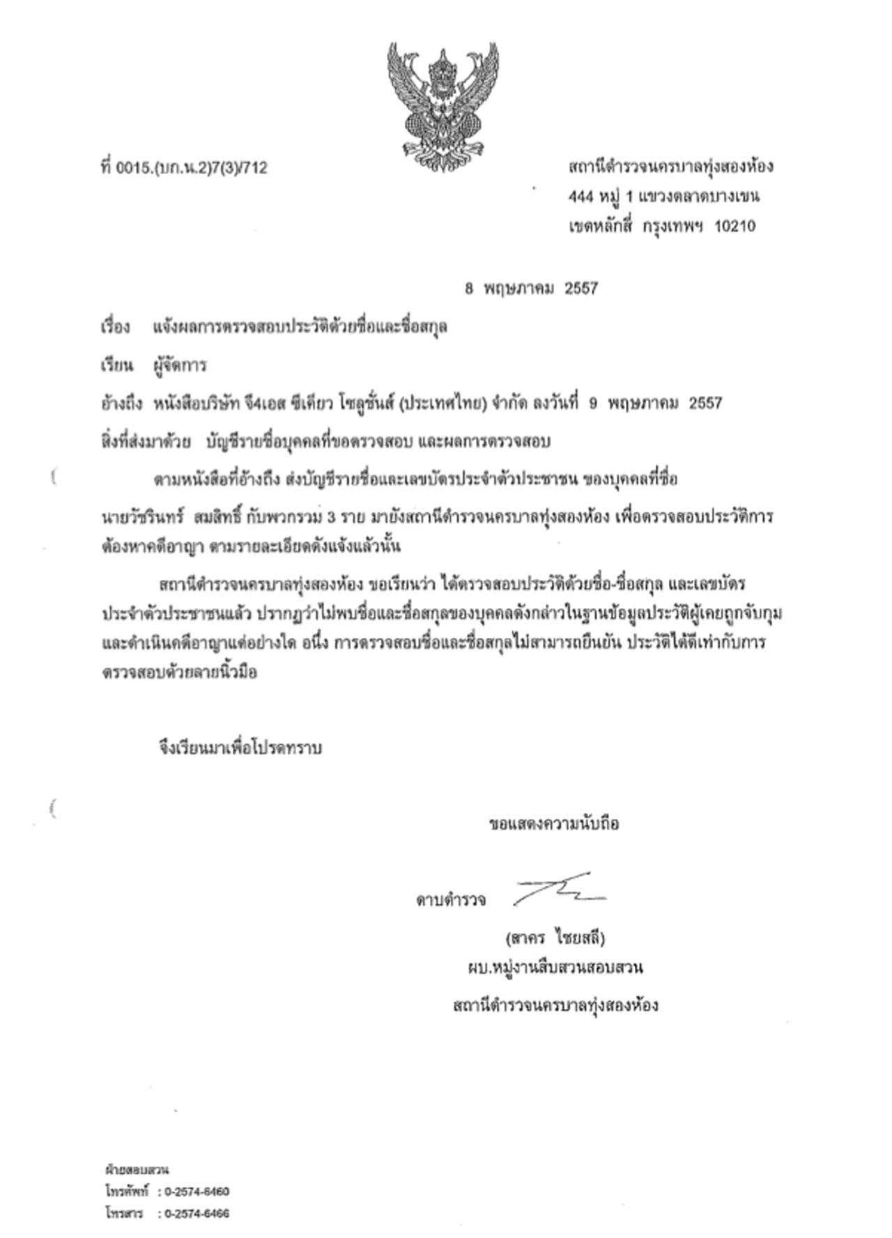 นอกจากนี้ สถานีตำรวจนครบาลทุ่งสองห้อง ได้ตรวจสอบประวัติของเจ้าหน้าที่รักษาความปลอดภัยผู้ก่อเหตุแล้ว ปรากฏว่า ไม่พบชื่อ-สกุล ของบุคคลดังกล่าวในฐานข้อมูลประวัติผู้เคยถูกจับกุมและดำเนินคดีอาญาแต่อย่างใด.