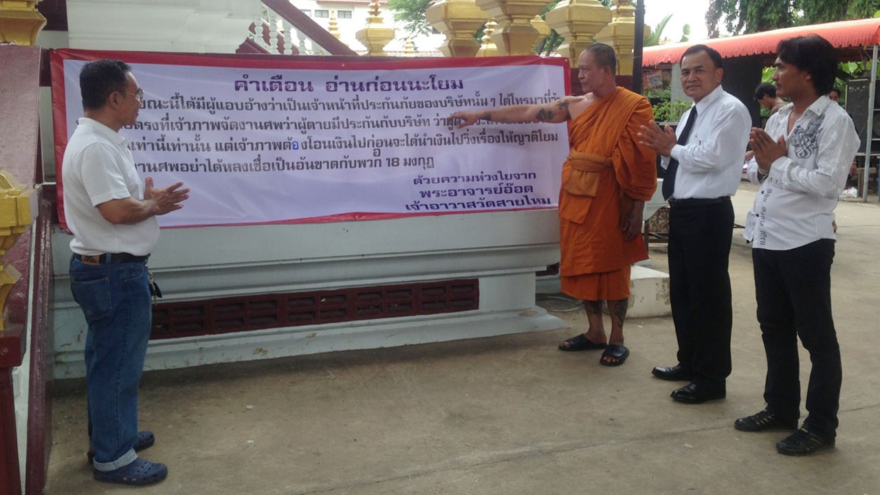 โดยผู้สื่อข่าวได้รับการเปิดเผยจากพระครูปลัดอิทธิพล ปทานิโก พระเกจิอาจารย์ชื่อดัง เจ้าอาวาสวัดสายไหม ต.คูคต อ.ลำลูกกา จ.ปทุมธานี ถึงสาเหตุที่ต้องมีการติดป้ายดังกล่าวว่า “ขณะนี้มีกลุ่มมิจฉาชีพออกตระเวนหลอกลวงมิจฉาชีพ ตระเวนหลอกลวงญาติโยมที่จัดงานศพอยู่ในวัด โดยกลุ่มมิจฉาชีพกลุ่มนี้จะทำการตรวจสอบตามวัดว่ามีการนำศพผู้เสียชีวิตมาตั้งบำเพ็ญกุศลหรือไม่ และผู้ตายนั้นเป็นใครที่ไหน จากนั้นก็จะทำทีเข้ามาติดต่อกับญาติของผู้ตายว่า ผู้ตายนั้นมีการทำเงินประกันชีวิต หรือมีกรมธรรม์ประกันชีวิตกับบริษัทนั้น บริษัทนี้เป็นวงเงินสูง เมื่อเสียชีวิตแล้วก็จะได้เงินตามกรมธรรม์ แต่ญาติๆ ของผู้ตายจะต้องมีค่าใช้จ่ายล่วงหน้าเพื่อเป็นค่าดำเนินการก่อน จึงจะได้เงินประกัน ซึ่งก็มีญาติผู้ตายที่หลงเชื่อเสียเงินให้กับกลุ่มมิจฉาชีพนี้ไป และเมื่อได้เงินคนกลุ่มนี้ก็จะหายตัวไปและไม่สามารถติดต่อได้อีกเลย