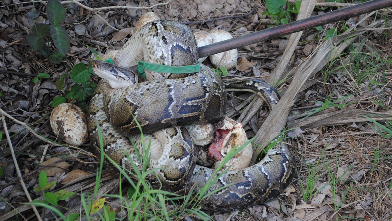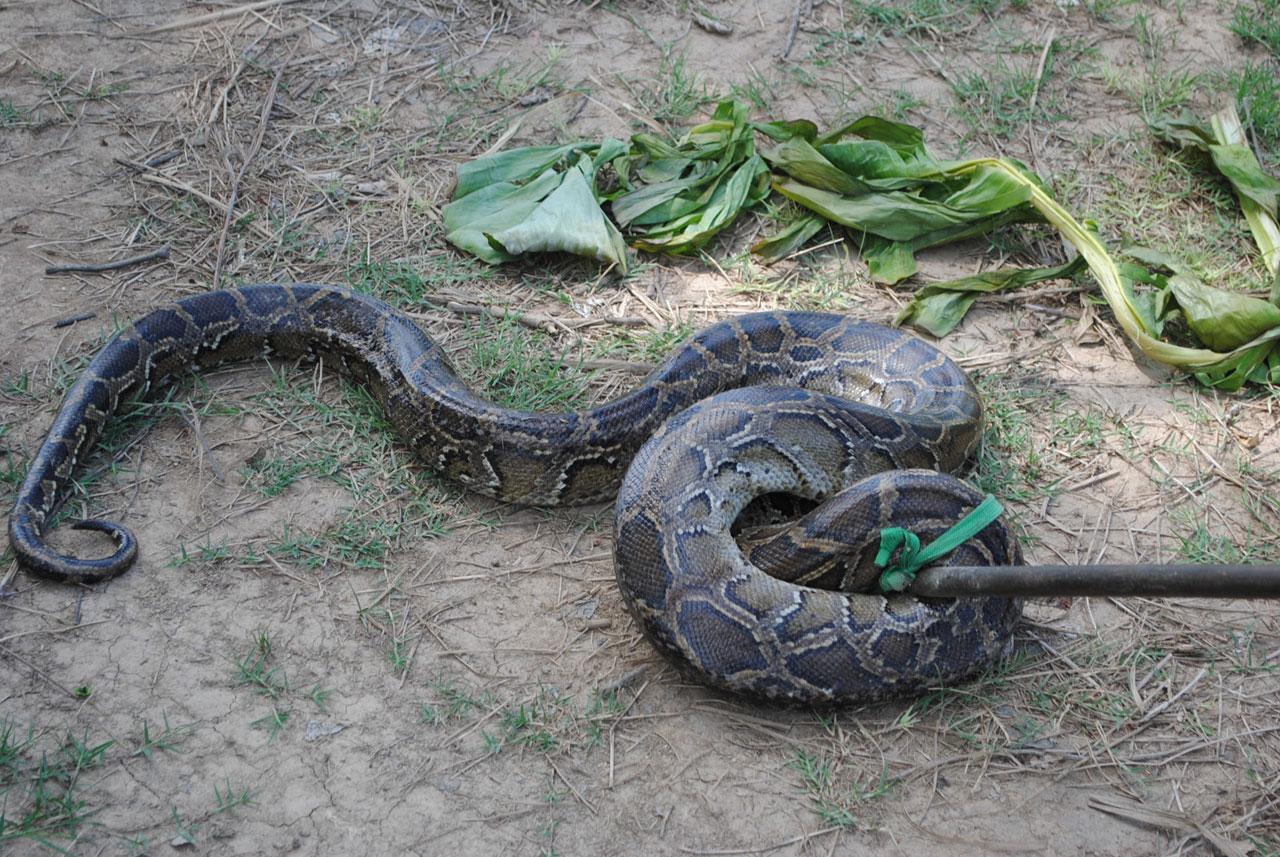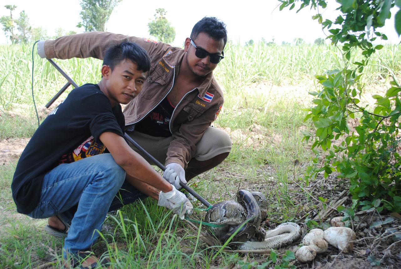 กระทั่งสามารถจับแม่งูเหลือมใส่กระสอบได้ จากนั้นได้เก็บไข่ของแม่งูเหลือมใส่ถุง ซึ่งนับได้จำนวน 17 ฟอง บางฟองไข่ฟักออกมาเป็นลูกงูเหลือมแล้ว แต่ลูกงูเหลือมได้ตายเสียก่อน อย่างไรก็ดี เจ้าหน้าที่จะได้นำแม่งูเหลือมและไข่ไปปล่อยคืนสู่ธรรมชาติต่อไป