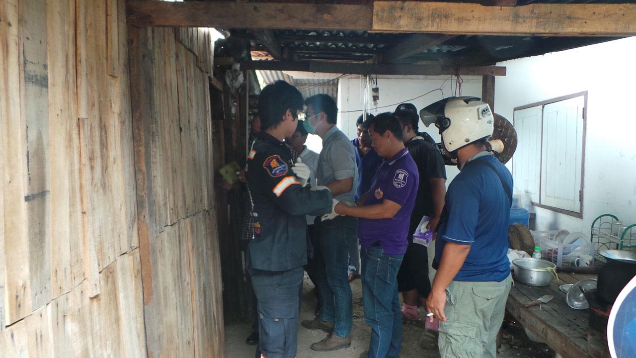 ที่เกิดเหตุพบศพ นายเต้ย ถาวร อายุ 40 ปี ชาวตำบลกุดเรือคำ อ.วานรนิวาส จ.สกลนคร สภาพศพใส่เสื้อเชิ้ตลายสกอต กางเกงขาสั้นลายพราง ใช้เชือกไนลอนผูกคอติดกับขื่อหลังคาหน้าประตูบ้าน สร้างด้วยไม้ลังมุงสังกะสี โดยสภาพศพขึ้นอืดส่งกลิ่นเหม็นตลบอบอวล