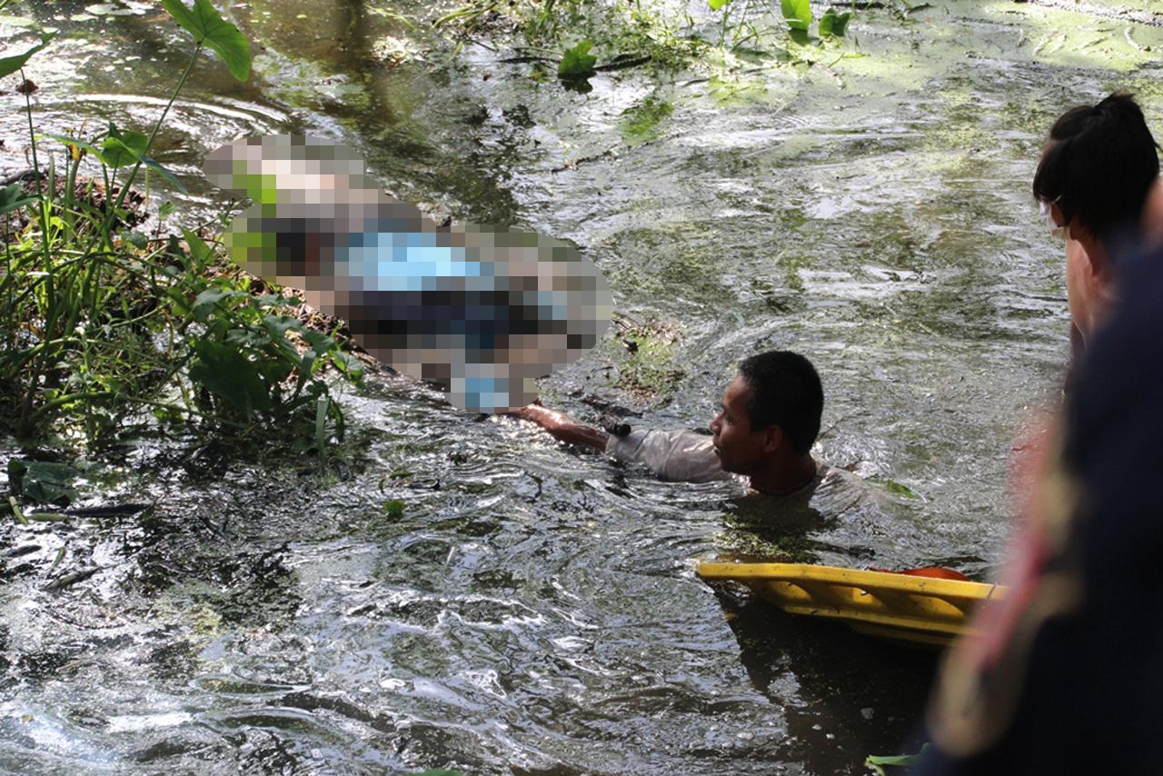 ผู้สื่อข่าวรายงายว่า ระหว่างเจ้าหน้าที่กู้ภัยฯ ช่วยกันลากศพขึ้นมาจากคูน้ำ ที่มีความลึกประมาณเกือบ 2 เมตร อย่างทุลักทุเล เนื่องจากสภาพศพเริ่มเปื่อย ส่งกลิ่นเหม็นคละคลุ้งไปทั่วบริเวณ