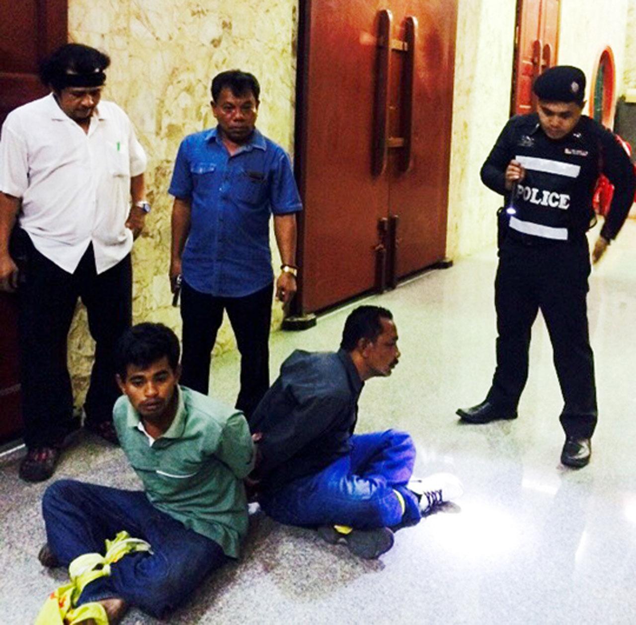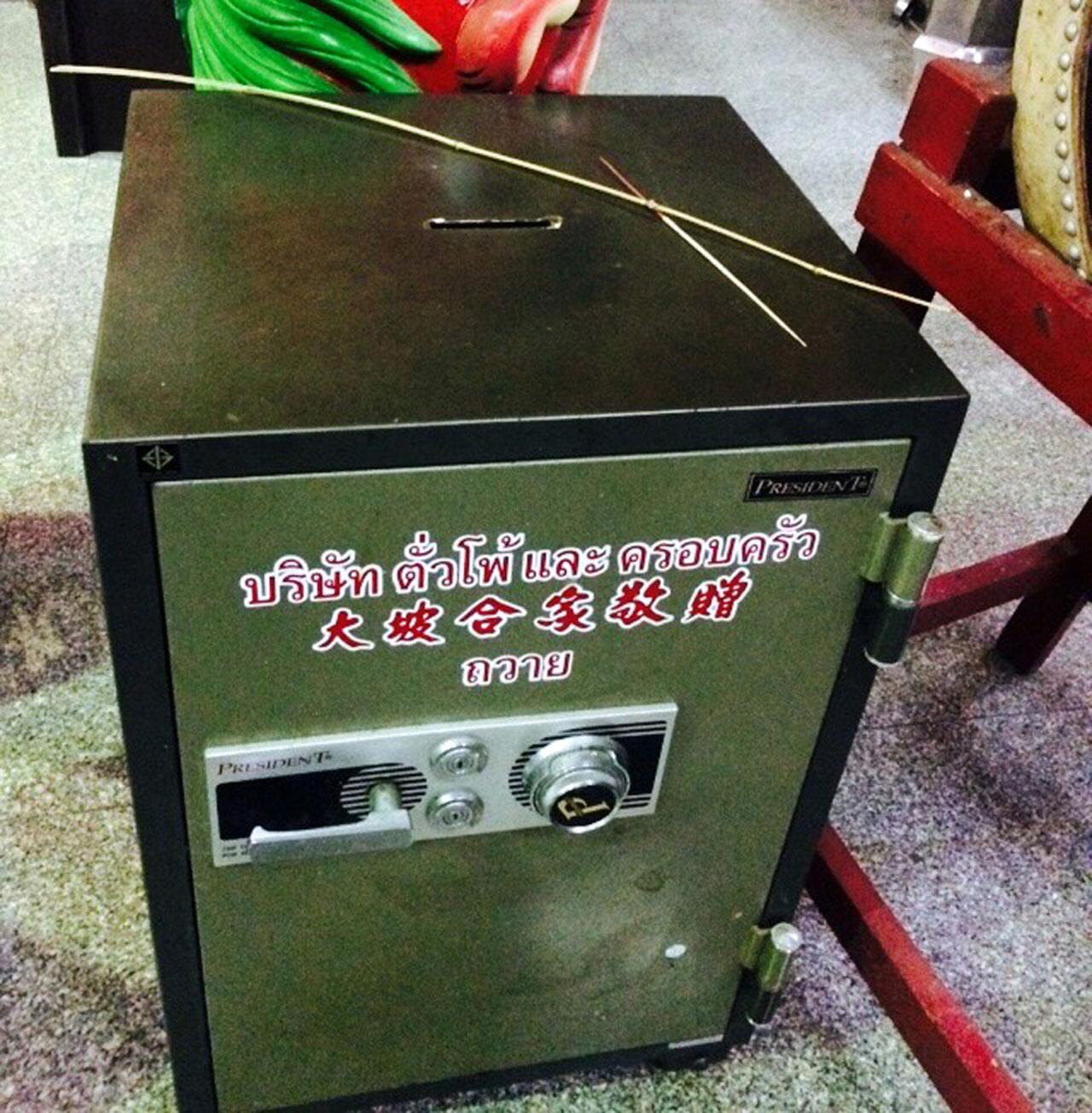 เมื่อเวลา 02.45 น. วันที่ 7 มิ.ย.ขณะที่ พ.ต.ท.ประสาน โตวอน สวป.สภ.ถลางร่วมกับ นายกิตติศักดิ์ โสตรักษา กำนันตำบลศรีสุนทร อ.ถลาง นายเฉลิมชัย คลองงาน ผู้ใหญ่บ้าน ม.3 ต.ศรีสุนทร อ.ถลางและสายตรวจอีกจำนวนหนึ่งออกตรวจตราพื้นที่รับผิดชอบ จนกระทั่งผ่านมายังศาลเจ้าท่าเรือ ถ.เทพกระษัตรี ต.ศรีสุนทร อ.ถลาง จ.ภูเก็ต พบชายต้องสงสัยจำนวน 2 คนยืนล้อมตู้บริจาคอยู่ภายในศาลเจ้า จึงแสดงตัวเข้าตรวจสอบ พบนายประสิทธิ์ ชาตรี อายุ 50 ปีและ นายอาซือมิง เจ๊ะอามะ อายุ 29 ปีกำลังใช้เหล็กเส้นแยงเข้าไปในช่องหยดเงินภายในตู้เหล็ก โดยที่ปลายใช้กาวแปะไว้เพื่อให้ธนบัตรในตู้ติดขึ้นมา เมื่อทั้ง 2 เห็นเจ้าหน้าที่ต่างพยายามจะวิ่งหลบหนี แต่ไม่พ้นถูกจับกุมตัวได้ จากการตรวจสอบพบเหล็กเส้นตกอยู่ที่พื้นใกล้ตู้บริจาค จึงควบคุมตัวไปสอบสวนที่ สภ.ถลาง