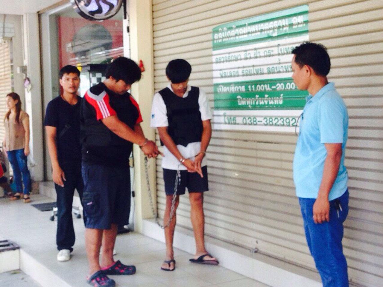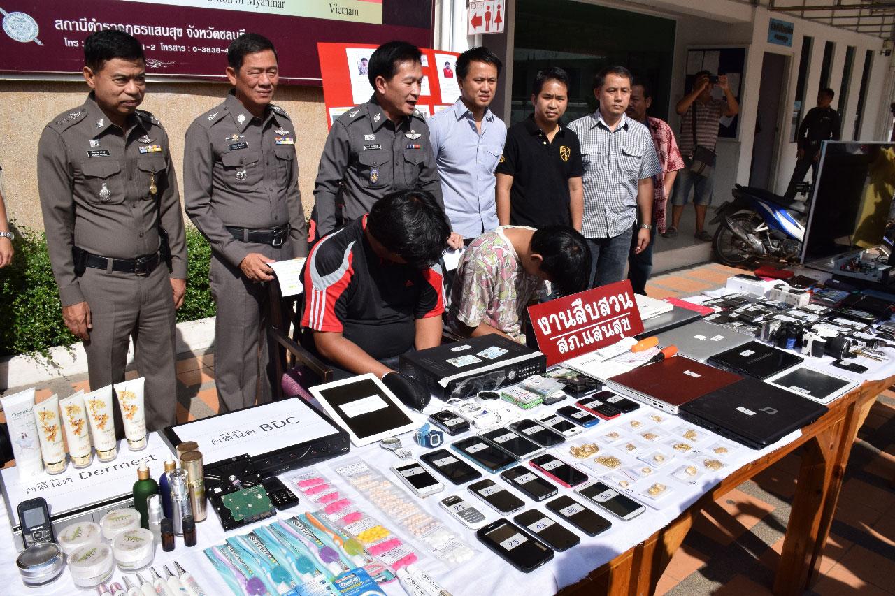 พล.ต.ท.ธเนตร์ แถลงว่า เนื่องจากเมื่อเวลาระหว่าง 02.30 น. ต่อเนื่อง เวลา 05.50 น. วันที่ 18 พ.ค. 58 มีคนร้ายงัดร้านบูรพารับฝาก (โรงรับจำนำเอกชน) ถ.ลงหาดบางแสน ต.แสนสุข อ.เมือง จ.ชลบุรี ได้ทรัพย์สินไปกว่า 100 รายการ มูลค่านับล้านล้านบาท และยังได้ถอดเอาฮาร์ดดิสก์กล้องวงจรปิดไปด้วย ต่อมา พ.ต.อ.เชี่ยวชาญ เพิ่มพูน ผกก.สภ.แสนสุข พร้อมชุดสืบสวน สภ.แสนสุข สืบทราบจากกล้องวงจรปิดใกล้ที่เกิดเหตุพบว่า คนร้ายคือ 2 ผู้ต้องหา ใช้รถเก๋ง ยี่ห้อโตโยต้า ยาริส สีขาว ทะเบียน ณฎ 7845 กรุงเทพมหานคร เป็นพาหนะในการก่อเหตุ จึงนำกำลังติดตามไปจับกุมคนร้ายทั้งสองได้ที่ภายในซอยพัทยา 16 พัทยากลาง หมู่ 4 ต.นาเกลือ อ.บางละมุง จ.ชลบุรี ข้างร้านก๋วยเตี๋ยวที่ผู้ต้องหาทั้งสองทำงานอยู่ และควบคุมตัวให้พาไปยึดของกลางได้ที่ห้องพักย่าน ซ.พัทยานาเกลือ 18 หมู่ 4 ต.นาเกลือ โดยผู้ต้องหารับสารภาพว่า นอกจากก่อเหตุคดีนี้แล้ว ยังได้เคยลงมือก่อเหตุลักทรัพย์คลินิกผิวหนัง เดอร์เมส เลขที่ 380/9-10 ต.แสนสุข อ.เมือง จ.ชลบุรี และคลินิกทำฟัน BDC ในเขตเมืองพัทยาอีกด้วย จึงอยากฝากถึงประชาชนที่สงสัยว่าเคยถูกคนร้ายทั้งสองก่อเหตุลักทรัพย์ให้มาตรวจสอบของกลางได้ที่ สภ.แสนสุข