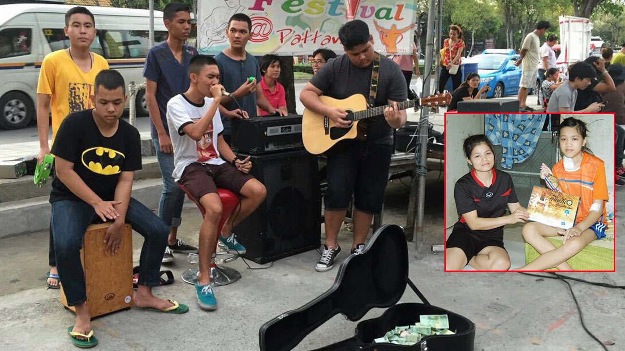 กลุ่มรุ่นพี่ ม.5 ร.ร.บดินทรเดชา (สิงห์ สิงหเสนี) 2 ตระเวนเล่นดนตรีเปิดหมวกหน้าตลาดปัฐวิกรณ์ และตลาดอื่นๆ นำเงินไปช่วยค่าฟอกไต “น้องยุ้ย” น.ส.อรัญญา รัศมีประภา (ภาพเล็ก) รุ่นน้อง ม.4 ที่ป่วยไตวายเฉียบพลัน.