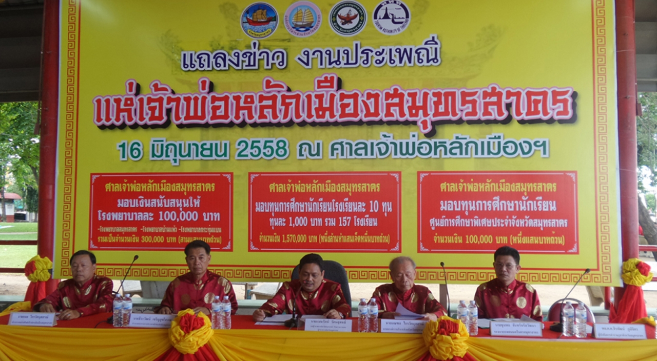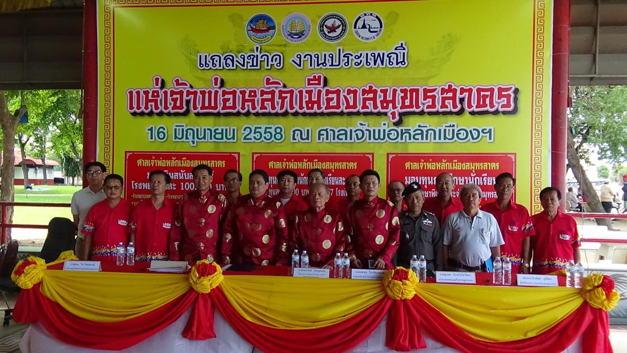 เมื่อวันที่ 16 มิ.ย. 58 ณ บริเวณหน้าศาลเจ้าพ่อหลักเมืองสมุทรสาคร ต.มหาชัย อ.เมือง จ.สมุทรสาคร นายแมนรัตน์ รัตนสุคนธ์ รองผู้ว่าราชการจังหวัดสมุทรสาคร รักษาราชการแทนผู้ว่าราชการจังหวัดสมุทรสาคร เป็นประธานการแถลงข่าว งานประเพณีแห่เจ้าพ่อหลักเมืองสมุทรสาคร ประจำปี 2558 โดยมี นายมณฑล ไกรวัตนุสสรณ์ นายกองค์การบริหารส่วนจังหวัดสมุทรสาคร นายชุมพล จันทร์จรัสวัฒนา รองนายกเทศมนตรีนครสมุทรสาคร นายธีรวัฒน์ เจริญสุขโสภณ ประธานคณะกรรมการบริหารศาลเจ้าพ่อหลักเมืองสมุทรสาคร และนายกมล ไกรวัตนุสสรณ์ ประธานชมรมศิษย์เจ้าพ่อหลักเมืองสมุทรสาคร เข้าร่วมในการแถลงข่าว