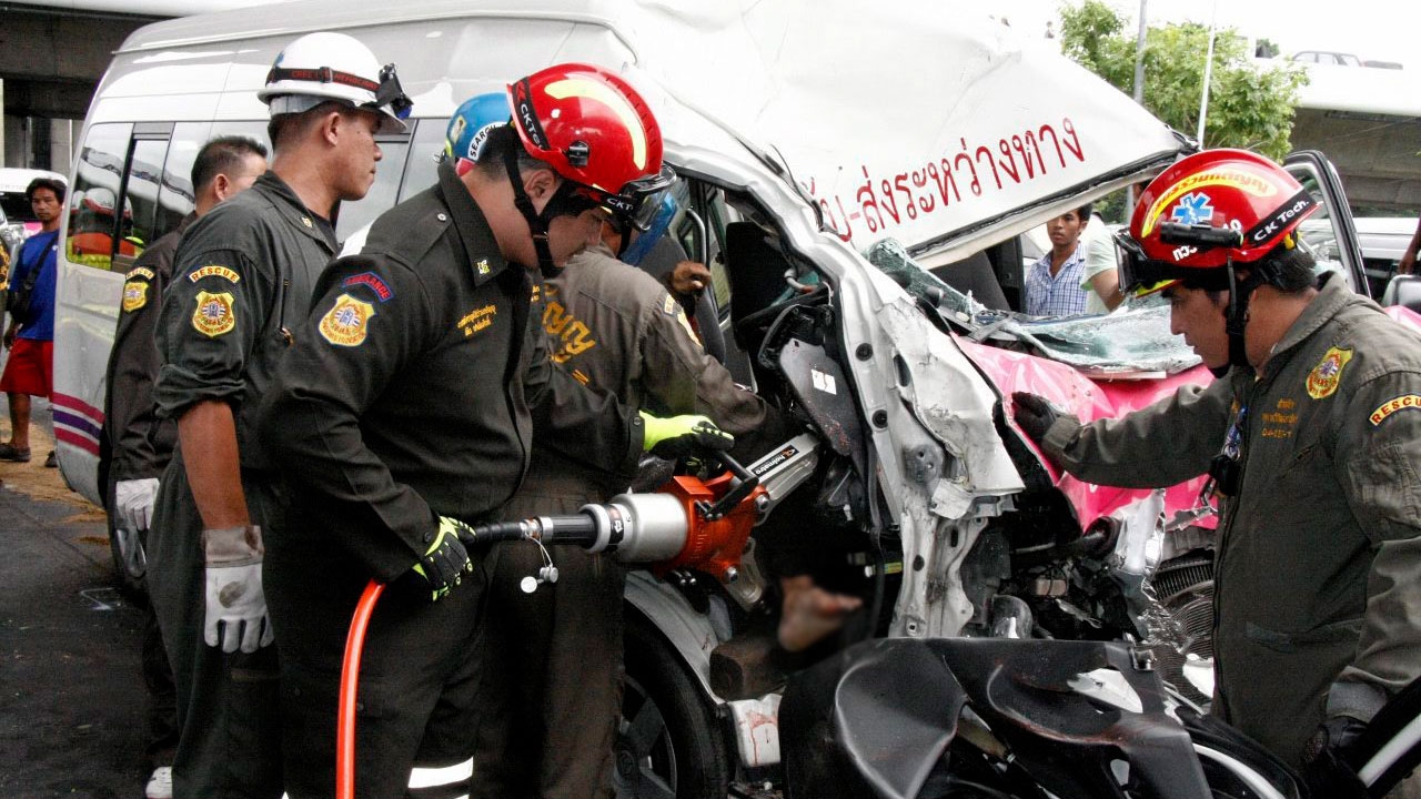 เจ้าหน้าที่ใช้ เครื่องตัดถ่างงัดร่างที่ไร้วิญญาณของนายสมชาย ฉายแสงเจริญ โชเฟอร์รถตู้โดยสารสายห้างเมอร์รี่คิงส์ปิ่นเกล้า-หมู่บ้านพฤกษา 3 ออกจากรถ หลังเกิดอุบัติเหตุชนกับรถอีซูซุ มิวเซเว่น บนถนนบรมราชชนนีฝั่งขาออกใกล้กับ รพ.สัตว์ตลิ่งชัน ทำให้นายอภิชา เสรีนิราช คนขับรถอีซูซุเสียชีวิตด้วย.