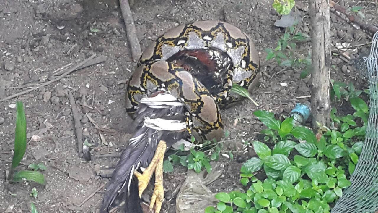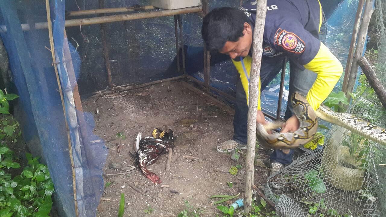 "เมื่อเจ้าหน้าที่มูลนิธิใต้เต็กตึ๊งมาถึง ก็รีบเข้าไปจับงูทันที เพื่อจะช่วยชีวิตไก่ชนที่กำลังถูกงูรัด จนสามารถจับงูแยกออกมาได้ แต่สุดท้ายไก่ชนก็ไม่รอด ซึ่งไก่ชนตัวนี้เป็นไก่ชนสายพันธุ์ดีที่ซื้อมาในราคาหลายพันบาท เคยนำไปชนจนชนะคู่ต่อสู้มาหลายครั้ง เคยมีนักพนันไก่ชนหลายคน มาขอซื้อเพื่อจะนำไปทำพ่อพันธุ์ให้ราคาถึงหลักหมื่นแต่ไม่ยอมขาย สุดท้ายก็มาตายกับงู ซึ่งคาดว่าน่าจะหิวโซ เลื้อยออกจากป่ามาหาอาหารกิน เสียใจมาก ถ้าทำได้ก็อยากจะฆ่างูตัวนี้ให้ตายไปเสียเลย" นายตุ้ย กล่าวในที่สุด
