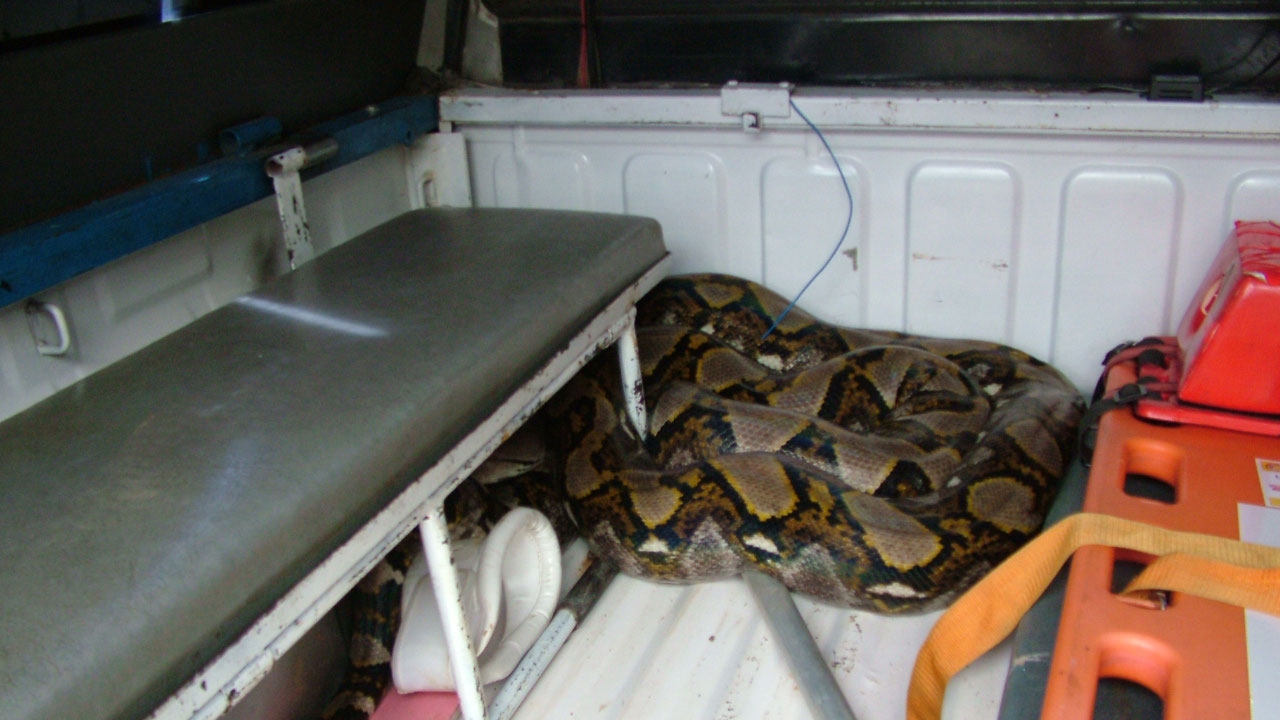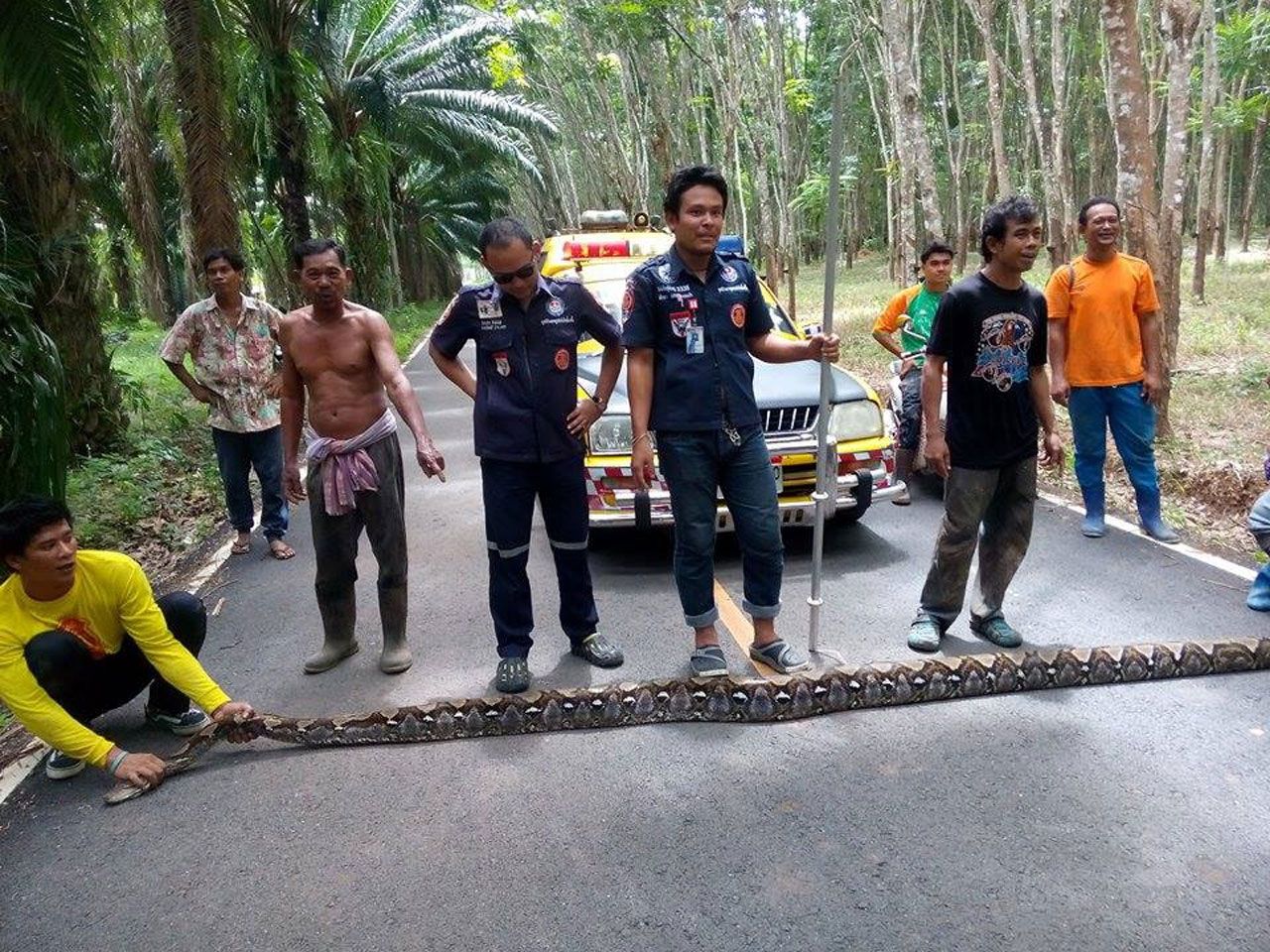 เมื่อเวลา 10.00 น. วันที่ 22 มิ.ย. 58 นายชาญวิทย์ บำรุงศี อายุ 32 ปี อาสาสมัครใต้เต็กตึ๊งทุ่งใหญ่ จ.นครศรีธรรมราช ได้รับแจ้งขอความช่วยเหลือจากนายจตุรงค์ นราอาจ อายุ 35 ปี ชาวสวนยางหมู่ 12 ต.ท่ายาง ว่าให้ช่วยส่งเจ้าหน้าที่อาสาสมัครเข้ามาตรวจสอบที่บริเวณสวนยางของตน เนื่องจากเมื่อช่วงเช้าที่ผ่านมาได้ลงเก็บยางแล้วไปเจอคราบงูเหลือมที่มีขนาดใหญ่ ลอกคราบทิ้งไว้อยู่กลางสวนยาง ทำให้ไม่กล้าที่จะเก็บยางอีกต่อไปเพราะเกรงจะเกิดอันตราย