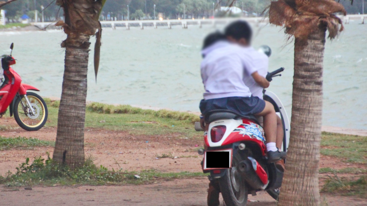 ทั้งนี้ ภาพที่เห็นเป็นนักเรียนชายหญิงวัยรุ่นคู่หนึ่ง ชั้นมัธยมตอนต้น อายุประมาณ 12 ปี อยู่ในชุดนักเรียนโรงเรียนชื่อดังของอำเภอสัตหีบ นั่งคร่อมอยู่บนรถจักรยานยนต์สีแดง กำลังพลอดรัก กอด จูบ หอมแก้มคลอเคลียกันชนิดไม่แคร์สายตาใครทั้งสิ้น โดยอยู่ในกิริยาอาการแบบนี้นานกว่า 1 ชั่วโมง