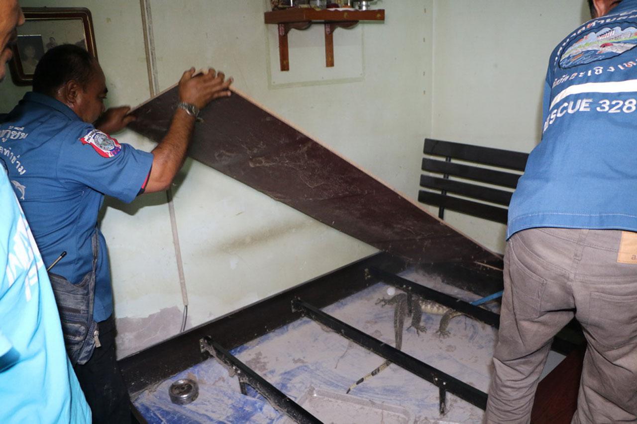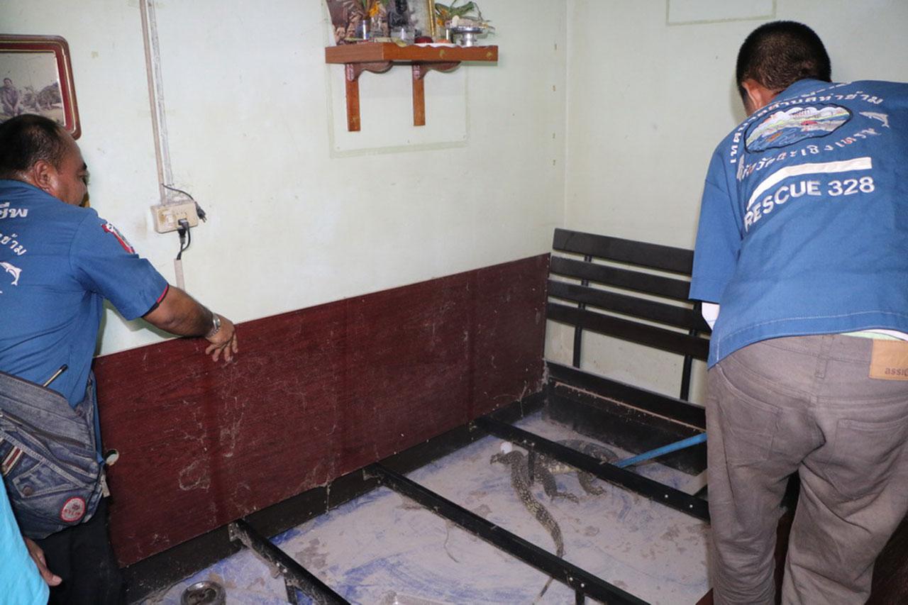 อีกราย หน่วยกู้ภัยเทศบาลตำบลท่าข้าม ไปตรวจสอบห้องเช่าเลขที่ 7/81 หมู่ 6 ต.ท่าข้าม อ.บางปะกง จ.ฉะเชิงเทรา หลังจากนางอำนวย สุขทวี อายุ 53 ปี ร้องขอให้มาช่วยจับตัวเงินตัวทอง พบว่าตัวเงินตัวทองวิ่งเข้าไปพบซุกอยู่ใต้เตียงนอน ทางกู้ภัยต้องช่วยกันยกที่นอน แล้วค่อยๆ เปิดไม้กระดานรองนอนออก จนพบตัวเงินตัวทองยาวประมาณ 1.50 เมตร นอนอยู่ใต้เตียง ใช้เวลาจับประมาณ 5 นาทีก็สามารถนำตัวออกมาได้