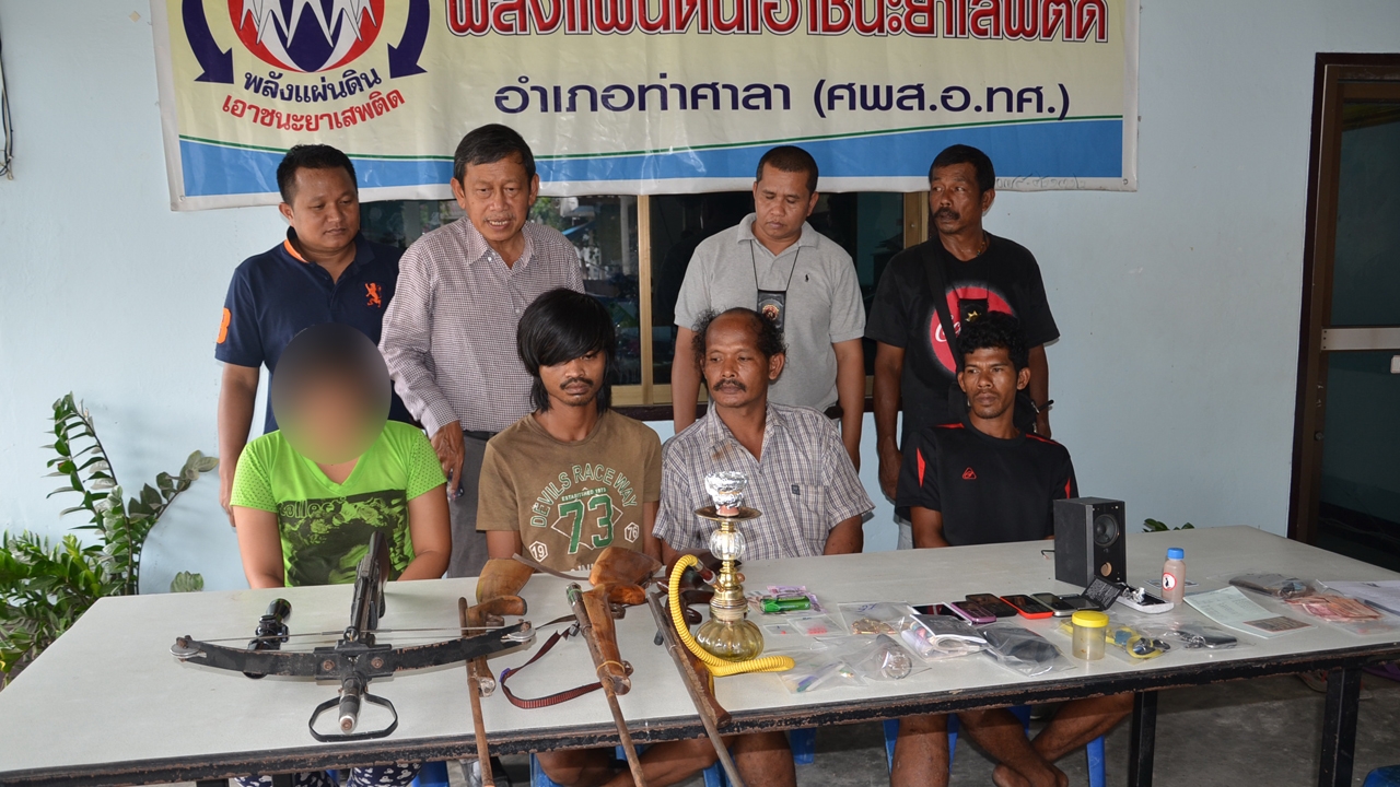 นายรังสรรค์ แถลงว่า ได้สั่งการให้ ปลัดอำเภอท่าศาลา ในฐานะหัวหน้าชุดจับกุม นำกำลังไปจับกุมนายเษกสม หรือ บังหลี ได้พร้อมยาบ้าจำนวนหนึ่ง แล้วขยายผลไปจับนายสมศักดิ์ หรือ โน นากุ้ง เจ้าของนากุ้งรายใหญ่ ต.ปากพูน ซึ่งเป็นหัวหน้า พร้อมลูกสมุนที่กำลังเสพยาบ้าในบ้าน โดยผลตรวจฉี่พบมีฉี่สีม่วง 3 คน คือนายสมศักดิ์ นายเษกสม และนายวิทยา ส่วน น.ส.สุพัตรา ลูกเลี้ยงนายสมศักดิ์ ไม่พบฉี่สีม่วงแต่อย่างใด ก่อนคุมตัวนำส่ง พนักงานสอบสวน สภ.ท่าศาลา จ.นครศรีธรรมราช ดำเนินคดีตามกฎหมายต่อไป.