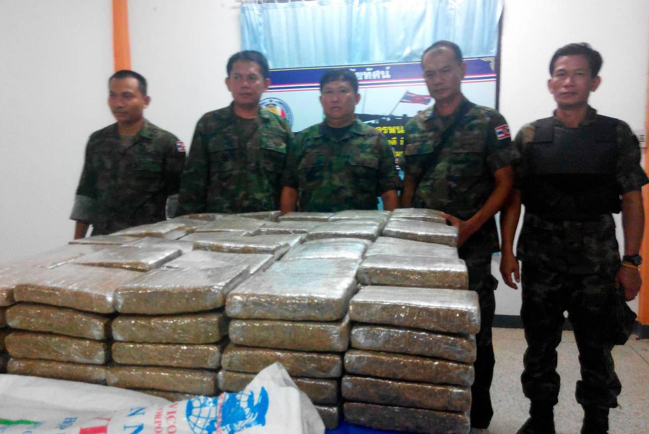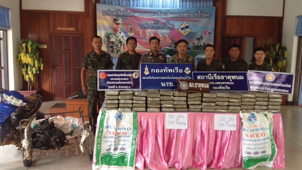 เมื่อเวลา 10.00 น. วันที่ 25 มิ.ย. 58 พล.ร.ต.อารักษ์ แก้วเอี่ยม ผู้บัญชาการหน่วยเรือรักษาความสงบเรียบร้อยตามลำแม่น้ำโขง (นรข.) นครพนม สั่งการให้ น.อ.ณัฐเกียรติ มนขุนทด ผบ.นรข.เขตนครพนม น.ต.บุญเชิด กุลอำภา หัวหน้าสถานีเรือ นรข. อ.ธาตุพนม และเจ้าหน้าที่เกี่ยวข้อง แถลงการณ์ตรวจยึดกัญชาอัดแท่ง จำนวน 200 แท่ง น้ำหนักรวมแท่งละ 1 กิโลกรัม รวม 200 กิโลกรัม โดยตรวจยึดได้ภายหลังสืบทราบว่า จะมีการลักลอบขนส่งกัญชามาจากประเทศเพื่อนบ้าน จึงระดมกำลังเข้าวางแผนสกัดกั้นปราบปรามจับกุม ตามแนวริมฝั่งแม่น้ำโขง จนกระทั่งเมื่อกลางดึกเมื่อคืนที่ผ่านมา พบชายต้องสงสัย 3-4 คน กำลังช่วยกันใช้รถเข็นขนสิ่งของต้องสงสัย บริเวณป่าช้า บ.คับพวง ต.น้ำก่ำ อ.ธาตุพนม จ.นครพนม จึงแสดงตัวเข้าตรวจสอบ แต่กลุ่มชายต้องสงสัย พากันวิ่งหลบหนีเข้าป่า ตรวจสอบภาพเป็นกระสอบบรรจุกัญชาอัดแท่ง จำนวน 5 กระสอบ ยึดเป็นของกลาง