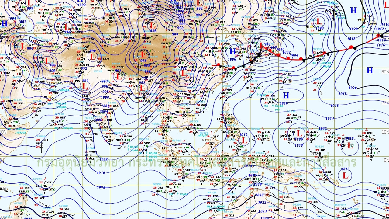 อุณหภูมิต่ำสุด 25 องศาเซลเซียส อุณหภูมิสูงสุด 33 องศาเซลเซียส บริเวณที่มีฝนฟ้าคะนองคลื่นสูงมากกว่า 2 เมตร