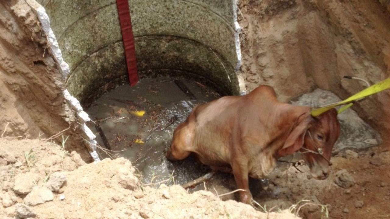 วัวท้องแก่พันธุ์มามั่นสีแดงเพศเมีย ตกลงไปในบ่อน้ำกลางสวนลึกประมาณ 2-3 เมตร พนักงาน อบต.พร้อมชาวบ้านใช้รถแม็คโครขุดดินรอบบ่อ แล้วเติมน้ำให้วัวลอยขึ้นมา ใช้เวลา 4 ชม. จึงสามารถนำวัวขึ้นมาได้ พบบาดแผลถลอกที่ก้นและหางเพียงเล็กน้อย