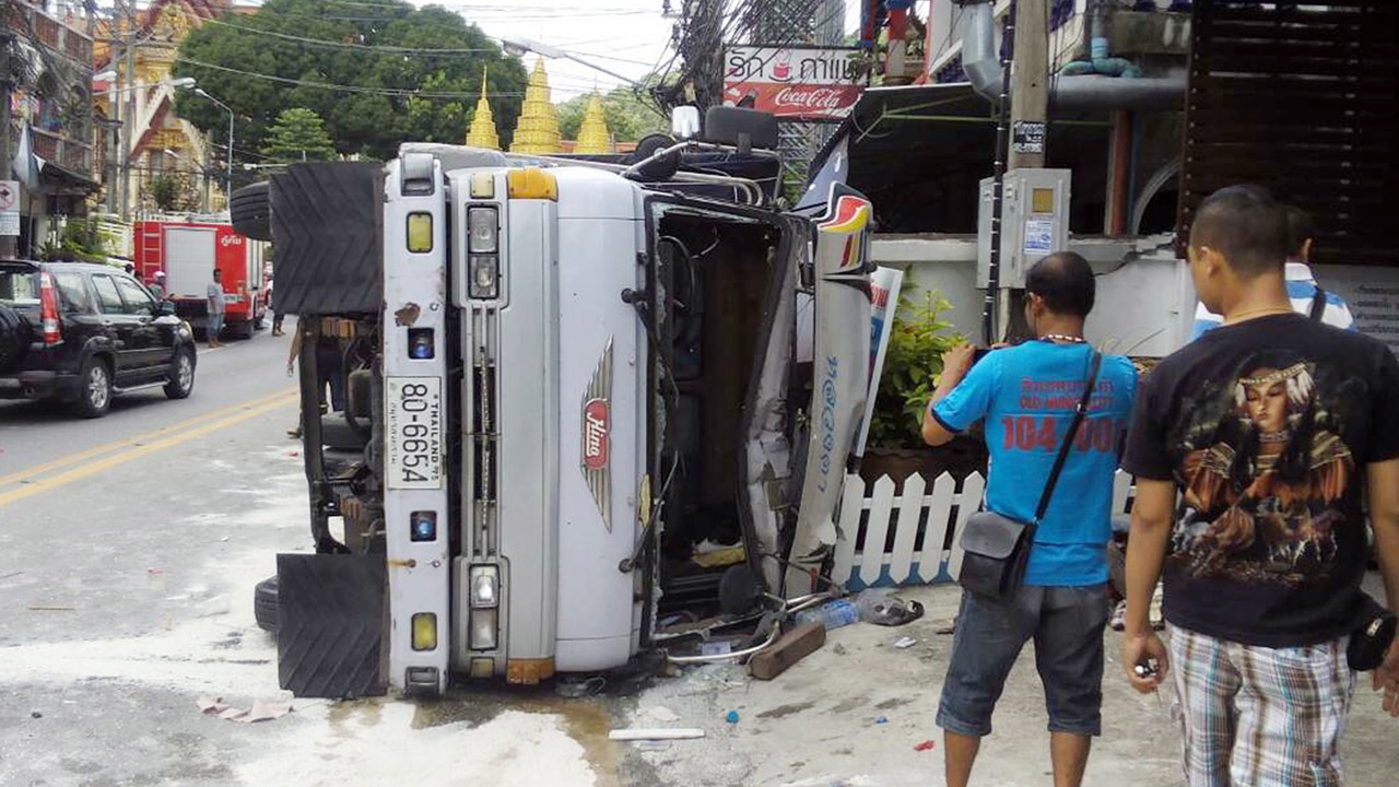 สอบสวนนายกิจชาญ กิจพิทักษ์ อายุ 50 ปี โชเฟอร์รถบรรทุกหกล้อทราบว่า ได้นำเกลือป่นบรรจุถุงพลาสติกจาก จ.สมุทรสงคราม มายังหาดป่าตอง อ.กะทู้ จ.ภูเก็ต เต็มคันรถ ขณะที่กำลังขับลงจากเขาป่าตองที่มีความลาดชันมาก รถเกิดเบรกแตกจนไม่สามารถควบคุมรถได้ ทำให้ชนกับรถเก๋ง และรถ จยย.ที่กำลังวิ่งอยู่บนท้องถนนล้มระเนระนาด และพังเสียหาย จากนั้นพยายามหักหลบโค้ง เพื่อไม่ให้ชนกับกำแพงปูนขนาดใหญ่ที่สร้างขึ้นมาเพื่อป้องกันการชน ทำให้รถเสียหลักชนกับหลังคาบ้านและสิ่งปลูกสร้างในบริเวณนั้นก่อนจะพลิกคว่ำดังกล่าว อย่างไรก็ดีเจ้าหน้าที่ตำรวจจะได้สอบสวนข้อเท็จจริงอย่างละเอียดอีกครั้ง.