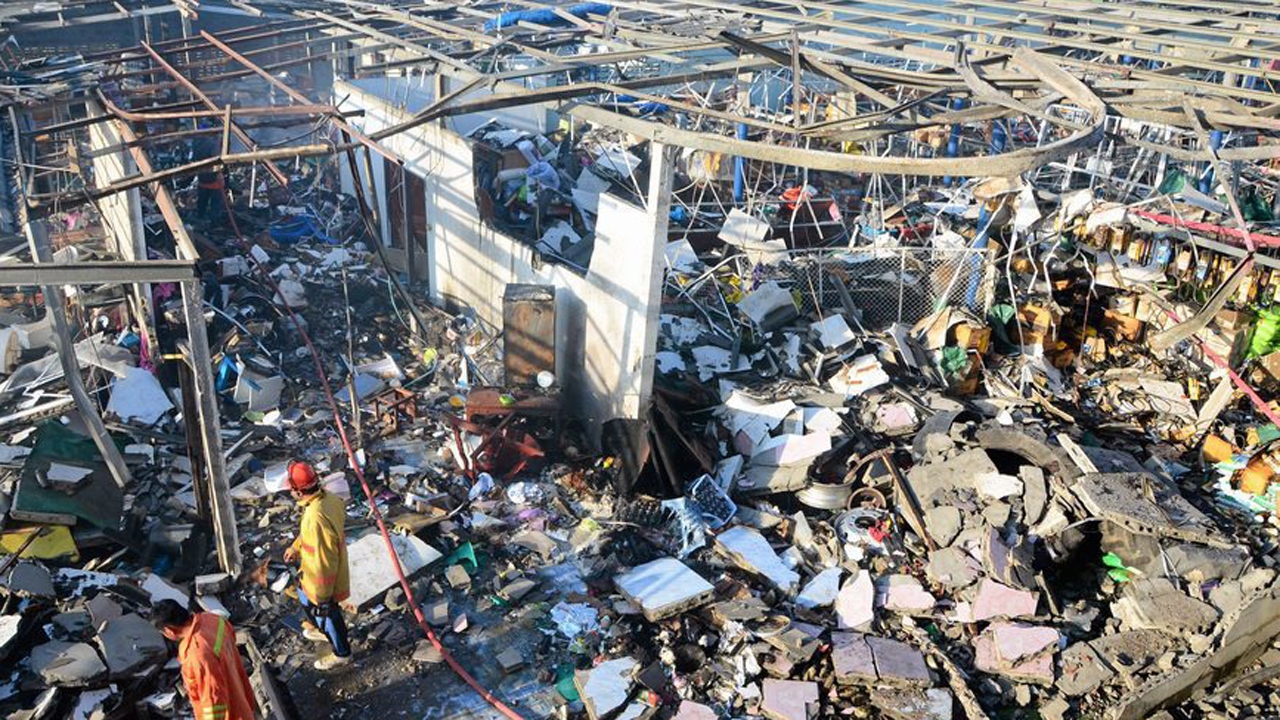 สภาพร้านประเสริฐพานิช เลขที่ 8/39 หมู่ 1 ต.ทับช้าง อ.สอยดาว จ.จันทบุรี ขายปุ๋ยและเคมีภัณฑ์เกษตร หลังเกิดระเบิดขึ้นอย่างรุนแรงพังยับ มีผู้เสียชีวิตเป็นลูกจ้างชาวกัมพูชา 3 ศพ และบาดเจ็บ 2 ราย คาดต้นเหตุมาจากสารโปแตสเซียมคลอเรตระเบิดเพราะอากาศร้อนจัด.