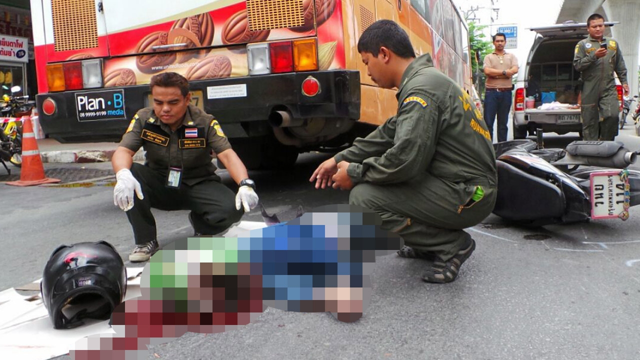 สภาพศพนายอมรเทพ แซ่ตั้ง ช่างซ่อมคอมพิวเตอร์ ถูกรถเมล์ สาย 80 วิ่งระหว่างวัดศรีนวลธรรมวิมล-สนามหลวง ทับศีรษะเละทั้งที่ สวมหมวกกันน็อก ขณะผู้ตายขี่ จยย.จอดคู่กับรถเมล์บริเวณทางม้าลาย ถนนเพชรเกษมฝั่งขาออก เลยห้างซีคอนบางแค จังหวะออกรถผู้ตาย เสียหลักล้มไถลเข้าใต้ท้องรถจนถูกเหยียบตายสยอง.