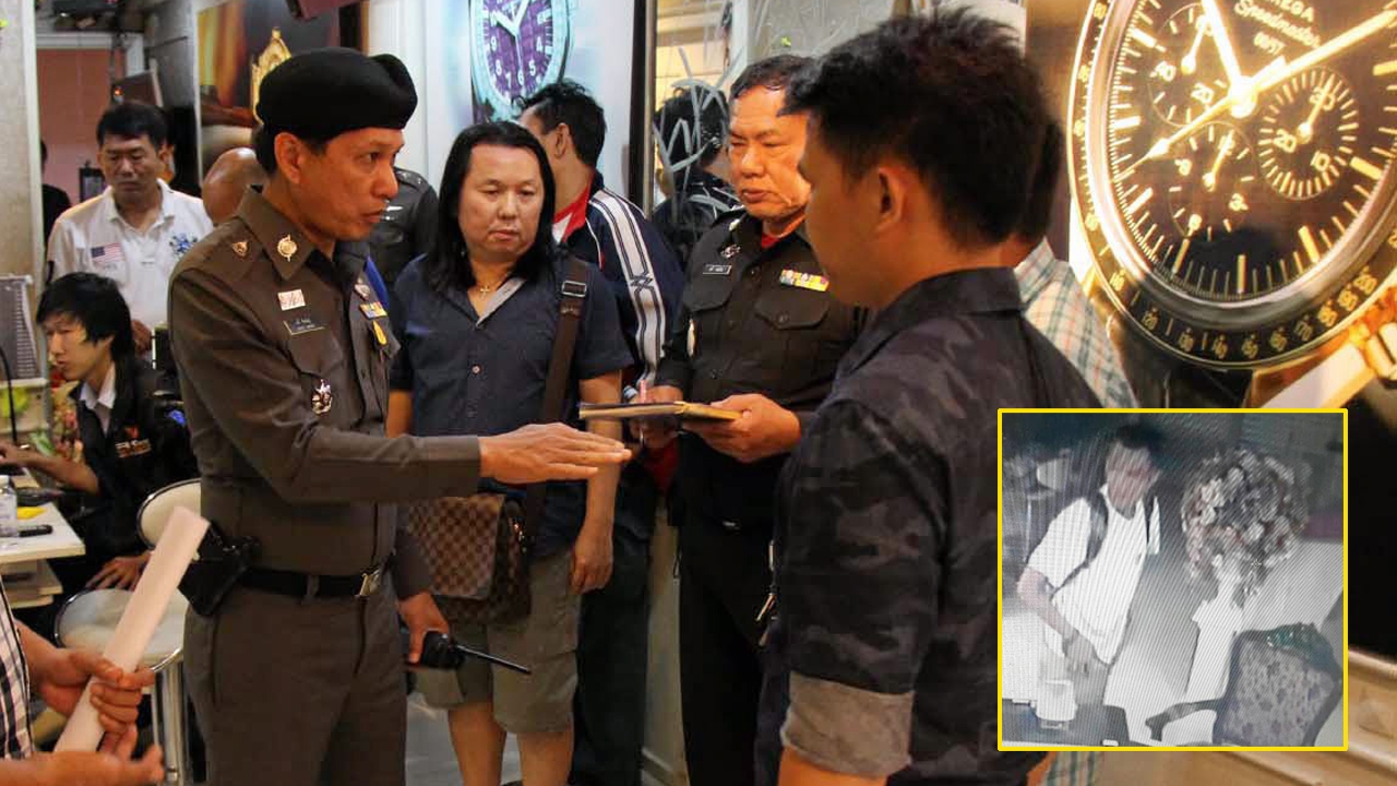 ตำรวจ สน.บางยี่ขัน ตรวจสอบที่เกิดเหตุภายในร้านเชอร์รี่นาฬิกา จำหน่ายนาฬิกาหรูชื่อดัง ริมถนนสมเด็จพระปิ่นเกล้า หลังคนร้าย (รูปเล็ก) เข้าไปลักทรัพย์โดยใช้มีดจี้คอพนักงานสาวแล้วใช้เศษผ้ามัดมือไพล่หลังผูกติดกับโต๊ะ ได้ทรัพย์สินไป 1 แสนบาท.