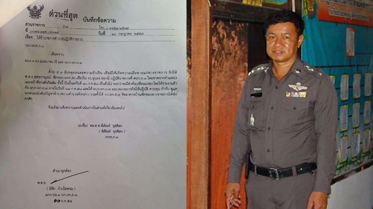 เมื่อวันที่ 11 ก.ค. มีรายงาน ว่า พล.ต.ท.พิสัณห์ จุลดิลก ผู้บัญชาการตำรวจภูธรภาค 3 มีหนังสือคำสั่งด่วนที่สุด เลขที่ 0018.132/4335 ลงวันที่ 10 ก.ค. 58 ให้ พ.ต.อ.สุทธกาญจน์ ฟักทอง ผกก.สภ.เขื่องใน จ.อุบลราชธานี ไปปฏิบัติราชการที่ ศปก.ภ 3 โดยขาดจากตำแหน่งและหน้าที่สังกัดเดิม ตั้งแต่วันที่ 10 ก.ค.เป็นต้นไป จนกว่าจะมีคำสั่งเปลี่ยนแปลง และให้ไปรายงานตัวกับผู้บังคับการอำนวยการตำรวจภูธรภาค 3 ภายในวันที่ 11 ก.ค.นี้