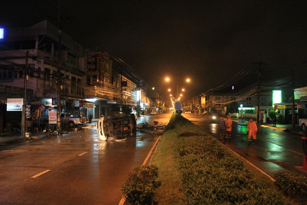 ระทึก! รถกระบะติดแก๊ส เสียหลักพุ่งข้ามเกาะกลางถนนกลางเมืองนครพนมไปชนเสาไฟฟ้าส่องสว่าง ก่อนตะแคงพลิกคว่ำ เดชะบุญไม่มีประกายไฟลุกไหม้จนถึงขั้นระเบิด ขณะ 2 โจ๋ลูกชายเจ้าของร้านเนื้อย่างชื่อดัง ได้รับบาดเจ็บเล็กน้อย...