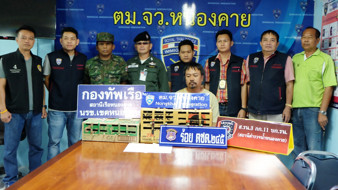 เมื่อเวลา 13.00 น. วันที่ 12 ก.ค.58 ที่ห้องสืบสวนตรวจคนเข้าเมืองหนองคาย ร.ต.อ.อภิชาติ คลธา รอง สว.ตม.หนองคาย พร้อมด้วยเจ้าหน้าที่ตรวจคนเข้าเมือง ตำรวจน้ำหนองคาย นรข.สถานีเรือหนองคาย ตชด.245 ได้ร่วมกันแถลงข่าวจับกุมนายพิชิต เยาวะ อายุ 44 ปี อยู่บ้านเลขที่ 255 หมู่ 3 ต.วัดหลวง อ.โพนพิสัย จ.หนองคาย พร้อมของกลางนกกรงหัวจุกอยู่ในลังกระดาษ 2 ลัง รวม 60 ตัว