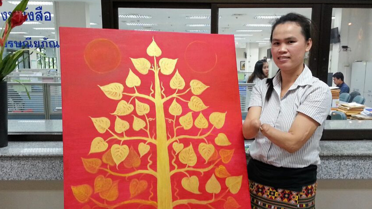 สาวสู้ชีวิต พิการมือขาด 2 ข้าง แต่มีพรสวรรค์บวกความอุตสาหะ ใช้สองแขนหนีบพู่กันบรรจงวาดรูปได้สวยจนน่าทึ่งรายนี้ ผู้สื่อข่าวรายงานเมื่อวันที่ 12 ก.ค. หลังได้พบหญิงพิการมากความสามารถคนหนึ่งยืนวาดภาพลงบนผืนผ้าใบขนาดใหญ่ที่สำนักงานประกันสังคม จ.นนทบุรี โดยมีคนยืนดูด้วยความสนใจ เนื่องจากภาพที่วาดลงบนผืนผ้าใบอย่างสวยงามนั้นมาจากการใช้แขน 2 ข้างที่ขาดตั้งแต่ข้อมือลงไป ประคองหนีบพู่กันบรรจงแต้มสีบนรูปต้นโพธิ์สีทอง