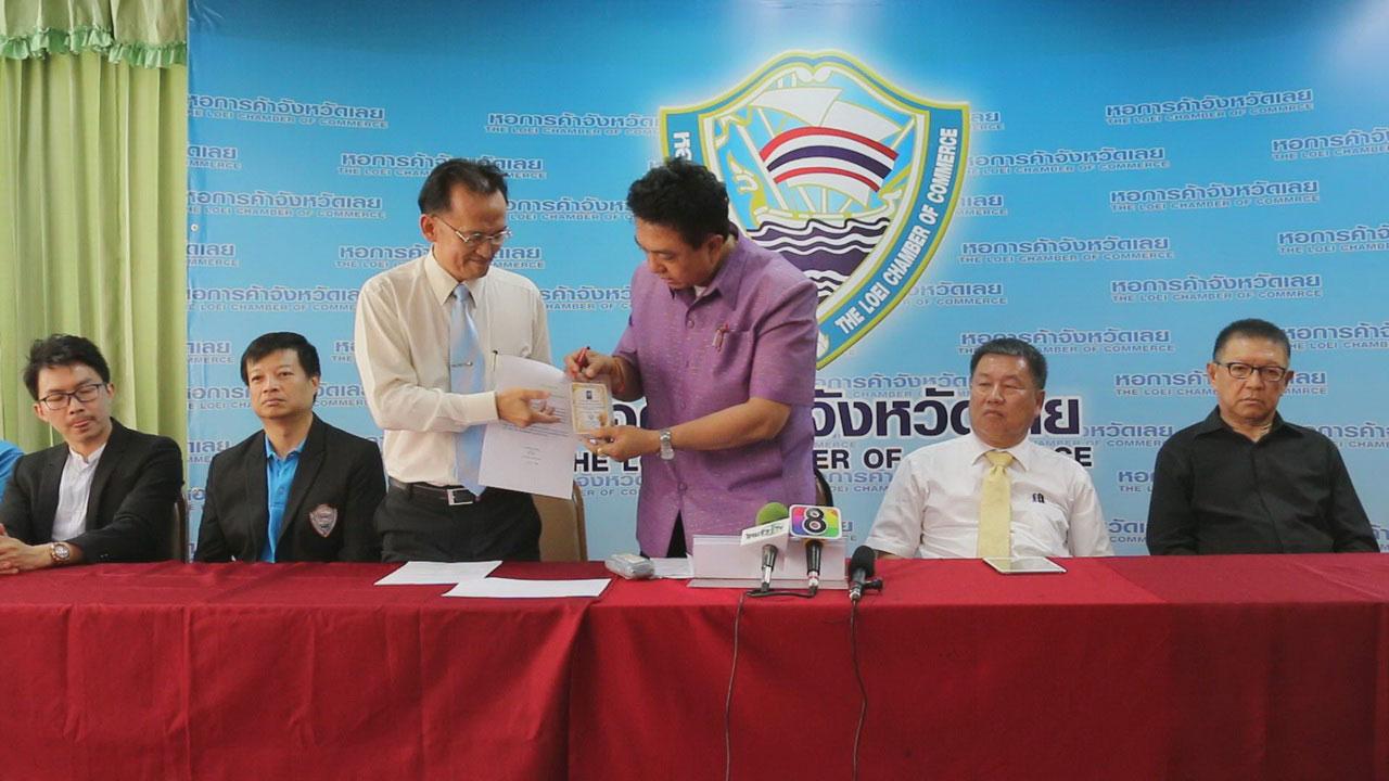 เมื่อเวลา 13.00 น. วันที่ 13 ก.ค. 58 ที่ห้องประชุมชั้น 2 หอการค้า จ.เลย นายชาญชัย เหลืองสุวรรณ รองประธานหอการค้า จ.เลย พร้อมคณะกรรมการหอการค้า ได้จัดแถลงข่าว เปิดใจถึงเหตุการณ์ที่เกิดขึ้น พร้อมยื่นหนังสือลาออก และมอบบัตรประจำตัว รองประธานหอการค้า คืนหอการค้า เป็นอันสิ้นสุดการดำรงตำแหน่งโดยสิ้นเชิง