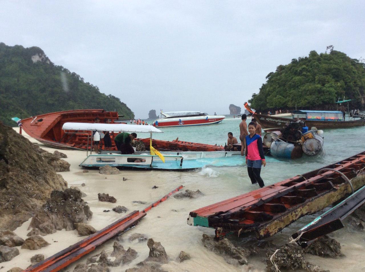 เมื่อวันที่ 14 ก.ค.58 พนักงานและคนเรือ ของบริษัท มัสหยาอันดามันทัวร์ เร่งกู้เรือมัสหยา 9 ขนาดยาว 15 เมตร กว้าง 2.80 เมตร ที่ถูกคลื่นขนาดใหญ่ซัดไปชนโขดหินจนเรือแตก เหตุเกิดเมื่อบ่ายวันที่ 13 ก.ค.หลังจากวันนี้คลื่นลมเริ่มสงบลง แม้จะแรงบ้างเป็นบางครั้ง เพื่อกู้เครื่องเรือ และเก็บไม้ที่แตกกระจัดกระจาย บริเวณระหว่างเกาะทับและเกาะหม้อ ของทะเลแหวก แหล่งท่องเที่ยวชื่อดังของจังหวัดกระบี่ เพื่อนำกลับเข้าฝั่ง