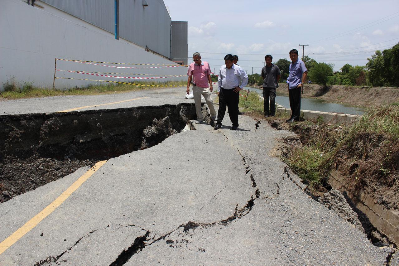 เมื่อเวลา 12.30 น. วันที่ 14 ก.ค. 58 ว่าที่ ร.ต.อภินันท์ เผือกผ่อง นายอำเภอบางบัวทอง จ.นนทบุรี รับแจ้งจาก นายนริต เจริญสุข ผู้ใหญ่บ้าน ม.8 ต.ละหาร อ.บางบัวทอง ว่า ที่ถนนเลียบคลองลำรี ม.8 เกิดการทรุดตัว จึงพร้อมด้วย นายจำลอง ขำสา ประธานสภาองค์การบริหารส่วนจังหวัดนนทบุรี และเจ้าหน้าที่เดินทางไปตรวจสอบ พบเป็นถนน คอนกรีตเสริมเหล็ก ด้านหลัง โรงงาน ศ.ศิลป์ ยาว 300 เมตร ทรุดตัวลงมา 120 เซนติเมตร ทำให้รถสัญจรไม่ได้ และได้นำเชือกมากั้นไว้ไม่ให้รถผ่านเกรงว่าจะเป็นอันตราย และมีการสไลด์ออกไปทางลำคลองอย่างต่อเนื่อง เนื่องจากน้ำในคลองลำรีลดลงเกือบติดก้นคลอง