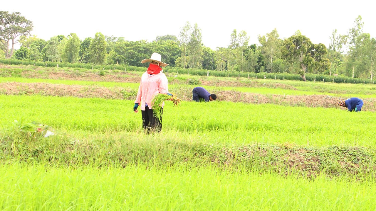 หลังจากฝนตกกระหน่ำในพื้นที่จังหวัดศรีสะเกษติดต่อกัน ทำให้น้ำท่วมขังในนา พื้นดินอ่อนนุ่ม ชาวนาเร่งถอนหญ้าเพื่อไม่ให้หญ้าท่วมต้นข้าว